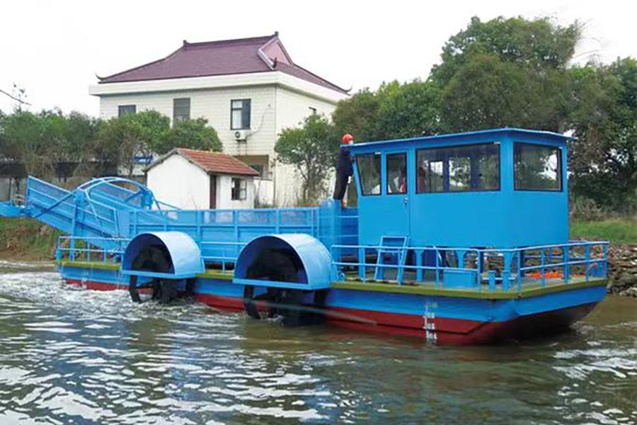 2. When the aquatic plant harvester unloads the harvested plants into the onboard conveyor storage, you can activate the storage conveyor motor to automatically adjust the loading quantity of the storage. During loading, the material moves from the storage conveyor to the storage, and during unloading, it moves from the storage to the storage conveyor.