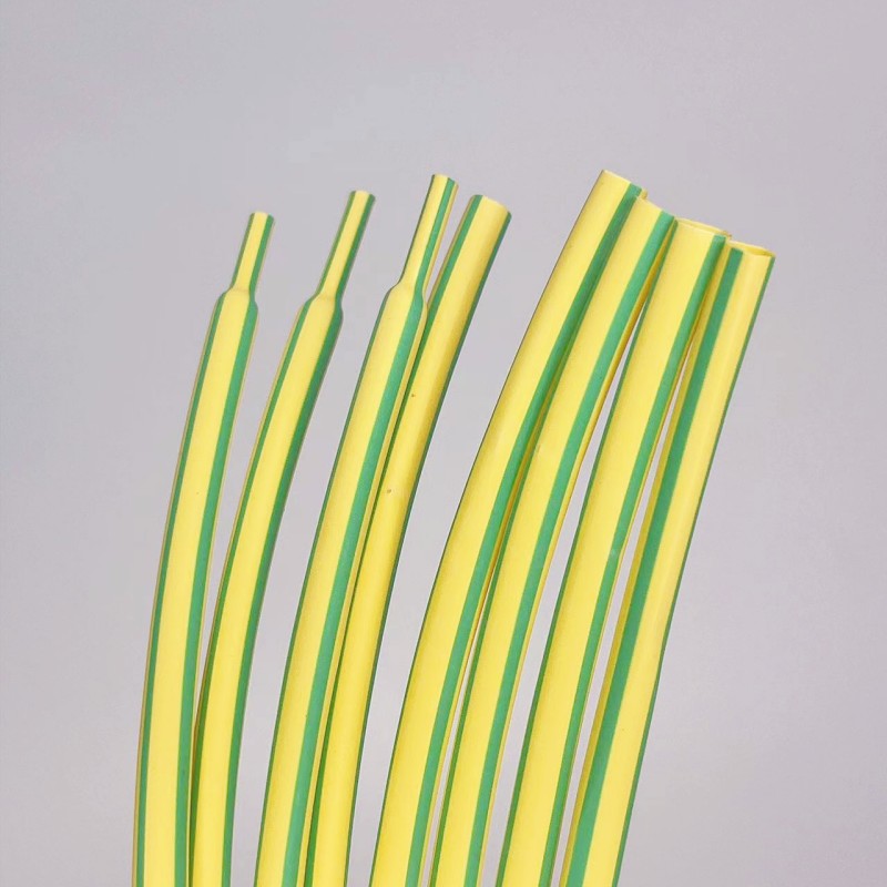Yellow-green bi-color heat shrinkable sleeve made of soft, flame-retardant, and radiation cross-linked polyolefin composite, specifically designed as a co-extruded yellow-green bi-color flame-retardant polyolefin heat shrinkable tube for earth wires.