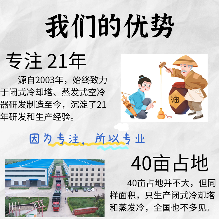 1. Compact Structure: Compared to crossflow towers, the product structure of the countercurrent tower is more compact, featuring more coil surface area for heat dissipation, making it more suitable for cooling projects with smaller temperature differences and higher flow rates.
