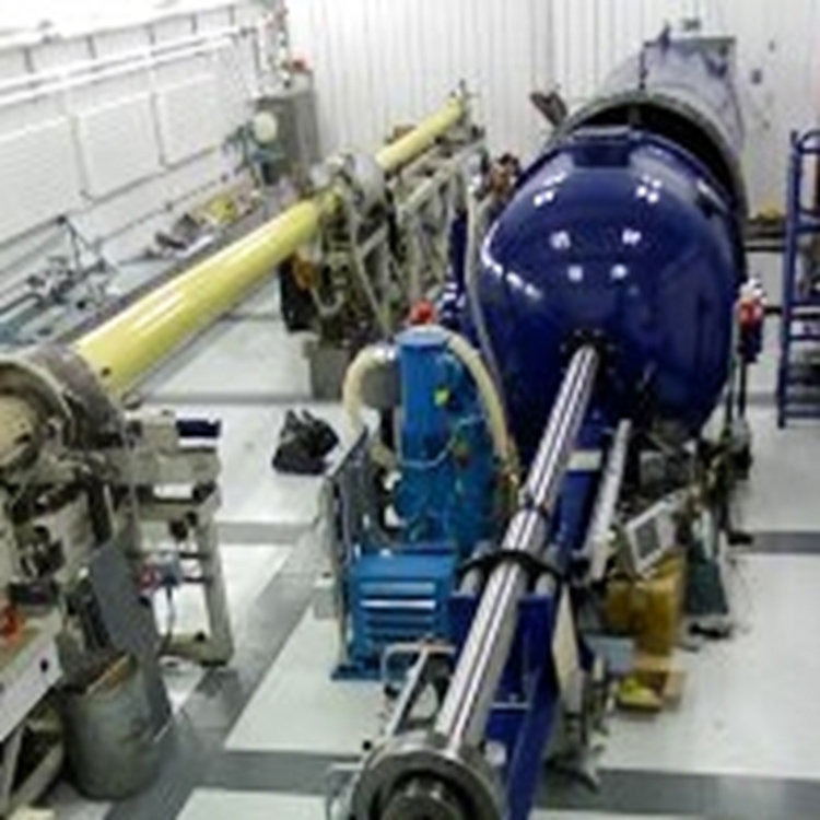 The primary light gas gun's gas expands continuously as the bullet moves, causing the base pressure to decrease, making it difficult to achieve super-high velocity. Therefore, the development of multi-stage light gas guns is required. In high-speed impact experiments, after the bullet's exit velocity exceeds 1.5 km/s, a two-stage light gas gun is generally considered, primarily consisting of the compression stage and the firing stage. The working principle is as follows: first, vacuum is drawn from the pump tube, firing tube, and target chamber. High-pressure nitrogen is then introduced into the high-pressure gas chamber, followed by filling a certain amount of hydrogen into the pump tube. (a) Ignition stage: the firing mechanism of the high-pressure gas chamber is triggered, and the piston compresses the hydrogen in the bullet's after-chamber, propelled by the high-pressure nitrogen. (b) Bullet firing stage: when the hydrogen pressure in the after-chamber reaches a certain level, the diaphragm bursts, and the bullet and bullet carrier behind the diaphragm are rapidly launched. (c) Bullet carrier separation and velocity measurement stage: the bullet carrier is intercepted by the bullet carrier separator, and the bullet continues to fly forward through the velocity measurement device. The velocity signal is recorded by an oscilloscope, used for calculating the bullet's velocity. (d) Bullet impact on target stage: the bullet impacts the target installed in the target chamber, and its transient process can be recorded by the flash X-ray high-speed imaging system and the optical high-speed camera.