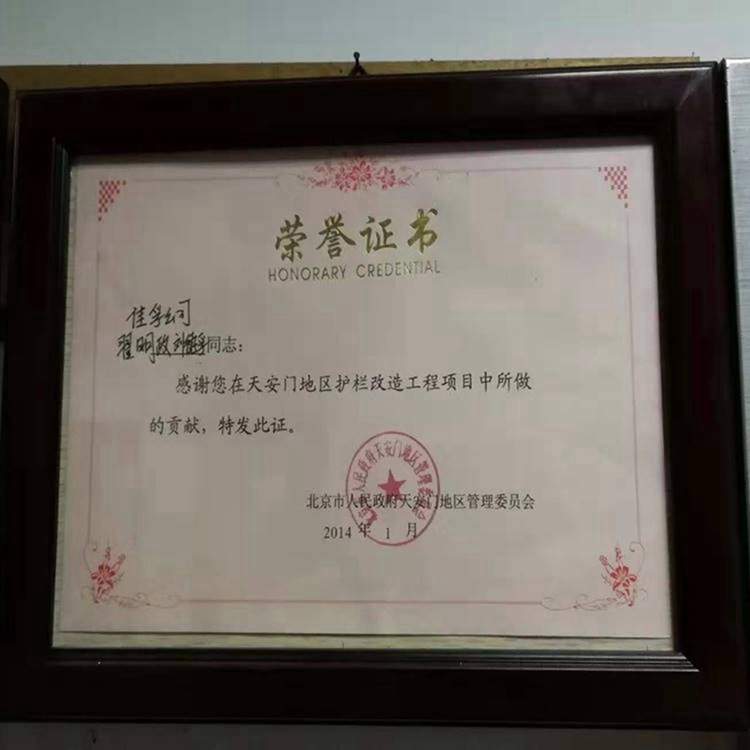 ; Participated in the production and processing of products for the Jinshui Bridge and the Great Hall of the People guardrail project in 2013; Participated in the production and processing of products for the Chang'an Avenue crash barrier project in 2014; And received commendation from the Tiananmen Management Committee;Participated in the production and processing of street guardrail projects in Baotou City in 2014;