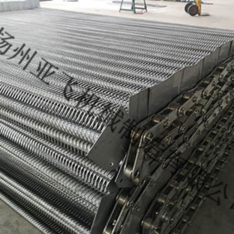 Slat conveyorThe conveyor belts are made of high-quality stainless steel, such as SUS304 and SUS316, offering excellent corrosion resistance, acid and alkali resistance, and can withstand temperatures above 600 degrees. The weaving patterns include chain-type, balanced, herringbone, horseshoe, and chain plate styles. The pitch of the belts is uniform, featuring a wavy design for the strips, with minimal elongation. They are primarily used for drying, sterilization, and cleaning of food, fruits and vegetables, and medicinal herbs. Driven by roller chain sprockets, they operate smoothly.