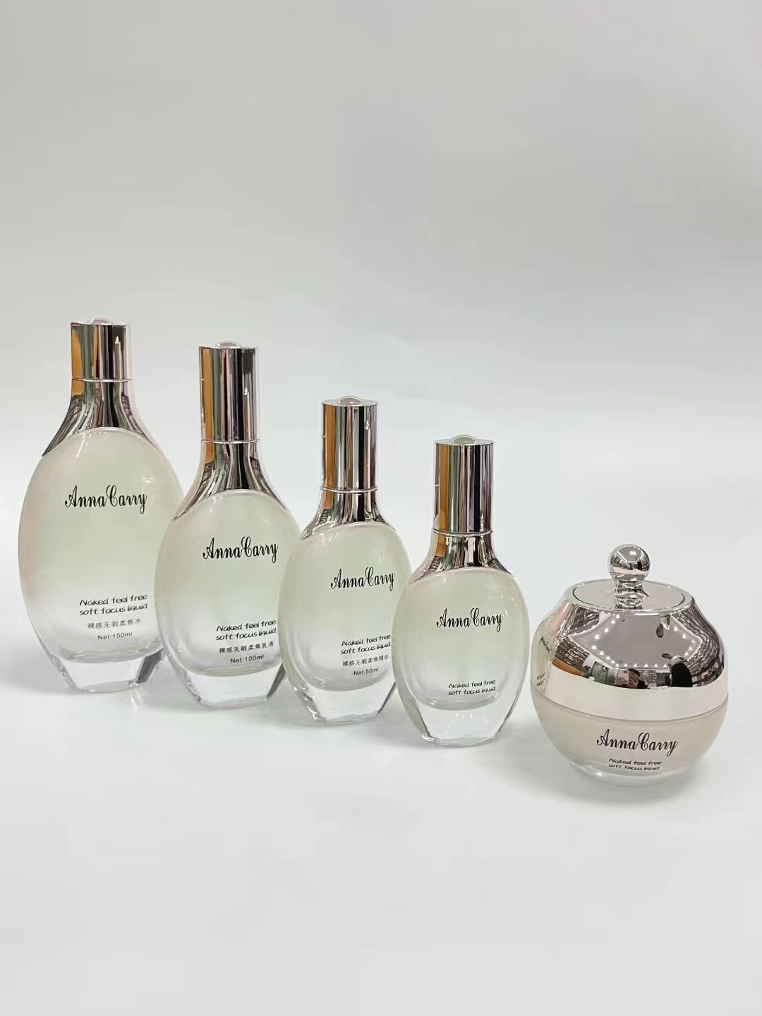 This cosmetic bottle in my possession is currently quite popular in the market. It consists of two layers of glass, with the inner lining featuring a sandblasted finish. Let me introduce our company's glass bottles, which cover a wide range of sizes for lotion bottles, essence bottles, foundation bottles, cream jars, and various types of perfume bottles, totaling over 3,000 different bottle designs. Despite the numerous variations in glass bottle designs, our company remains committed to a single principle: quality assurance. We strictly adhere to the ISO9001:2008 quality management system in production, ensuring our product quality is at an industry-leading level, with our cosmetic glass bottles even meeting the quality requirements for food-contact glassware.