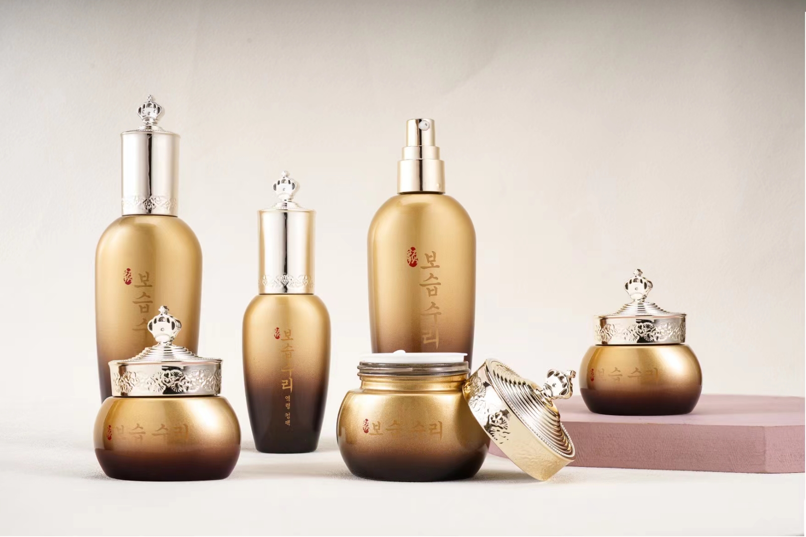 This cosmetic bottle in my possession is currently quite popular in the market. It's made of two layers of glass, with the inner lining featuring a sandblasted finish. Let me introduce, our company produces glass bottles in various diameters, including lotion bottles, essence bottles, foundation bottles, cream jars, and a wide range of cosmetic bottles, totaling over 3,000 different bottle types. Despite the myriad designs of glass bottles, our company has always adhered to one principle: quality assurance. We strictly manage production according to the ISO9001:2008 quality management system, ensuring our product quality is at the industry's forefront, with our cosmetic glass bottles even meeting the quality requirements for food-contact glassware.