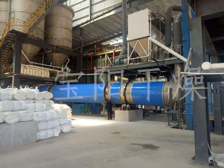 (D) Drum Dryer Working Principle: The wet material to be dried is conveyed to the hopper by a belt conveyor or a bucket elevator. It is then fed into the charging end through the feeding pipeline by the hopper's feeding machine. The slope of the feeding pipeline must be greater than the natural angle of repose of the material to ensure smooth flow into the dryer. The dryer drum is a rotating drum slightly inclined from the horizontal line. The material is added from the higher end, while the heat carrier enters from the lower end, contacting the material in a countercurrent manner. There is also a situation where the heat carrier and material enter the drum simultaneously. As the drum rotates, the material moves under gravity to the lower end. During the forward movement of the wet material within the drum, it receives heat directly or indirectly from the heat carrier, leading to drying. The dried material is then discharged at the outlet end via a belt conveyor or a screw conveyor. Scrapers are mounted on the inner wall of the drum, which function to lift and scatter the material, increasing the contact surface with the airflow to enhance the drying rate and promote material movement. Heat carriers are typically hot air, flue gas, etc. After passing through the dryer, the gas is usually collected by a cyclone separator to remove the carried material. To further reduce the dust content in the exhaust gas, it should pass through a bag filter or a wet scrubber before being emitted.