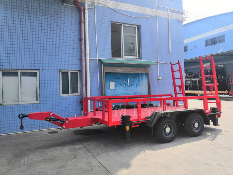 The trailer has a carrying capacity of 8T, constructed with 8# type steel structure welding, and the platform dimensions are 4 meters in length and 2 meters in width. The platform height is approximately 0.6 meters, with a 4mm thick patterned plate laid on the surface. The vehicle body is equipped with guardrails on the front, left, and right sides, with the guardrail height being about 0.3 meters.