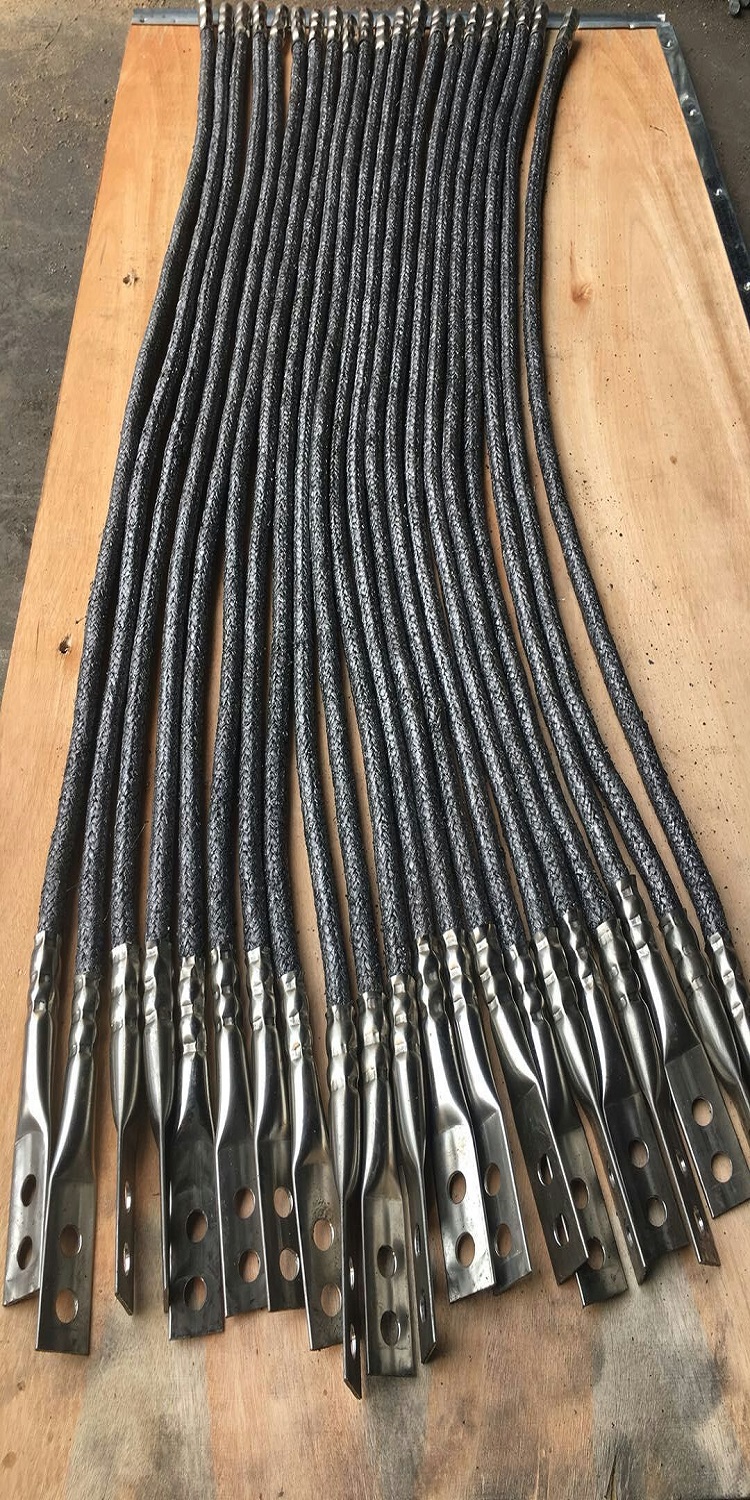 Flexible graphite grounding bodies are made from high-carbon graphite wire and feature stainless steel alloy terminals for connection to poles and towers, representing a new type of non-metallic conductive material. They offer low resistivity, stable grounding resistance, resistance to high and low temperatures, corrosion resistance, ability to withstand high current surges, maintenance-free operation, ease of installation, and use that is not restricted by environmental or climatic conditions. Particularly suitable for use in acidic, alkaline soils, marshes, humid regions, beaches, and mountainous areas with difficult construction and high soil resistivity.