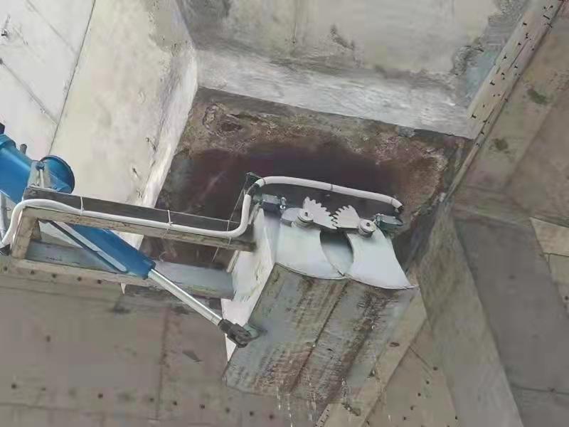 The gate is composed of components such as the main body, sector gate plate, shaft, gears, sealing pairs, and actuator. The gate is manually or actuator-pushed to rotate the sector gate plate around the shaft, causing the two sector gate plates to open to the sides, allowing the material to fall. Once the receiving device is fully loaded, the actuator moves the lever to reset the sector gate plate, closing off the falling material.