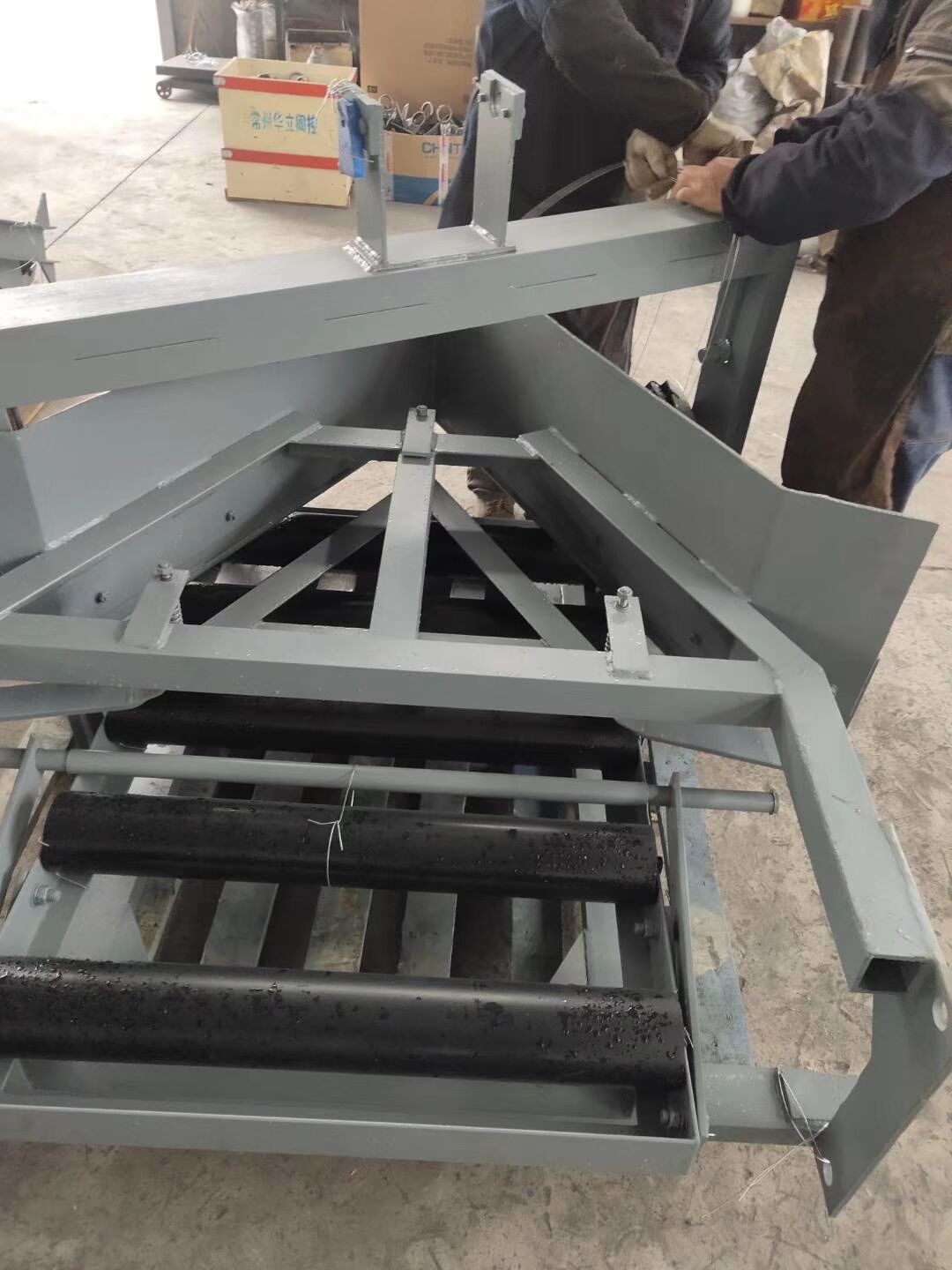 6. Lock-gas Section Usage: (1) Ensures even material distribution, preventing misalignment, material sticking, and spillage along the way. (2) Reduces induced airflow, slowing it down to less than 10% of the original speed. (3) Suitable for conveying sticky, wet, large pieces, powdery materials, and preventing clogging.Electromagnetic variable slot angle scraper unloader working principleThe electro-hydraulic犁式卸料机 is powered by an electric hydraulic push rod. During operation, the rod extends to act on the drive rod. Drive the frame forward, complete the lowering of the plow blade, and support the flat roller assembly, ensuring the belt working surface is flat. The lower edge of the plow blade is tightly sealed to the belt surface, depositing the material on the running belt into the hopper (chute) or at the desired location. Upon completion of unloading, activate the push rod to retract, pulling the frame backward, lifting the plow blade, and changing the variable groove angle roller assembly from flat to groove shape, restoring the belt working surface to a grooved state for smooth material passage; due to the use of hydraulic transmission in the electric hydraulic push rod, it features automatic overload protection.
