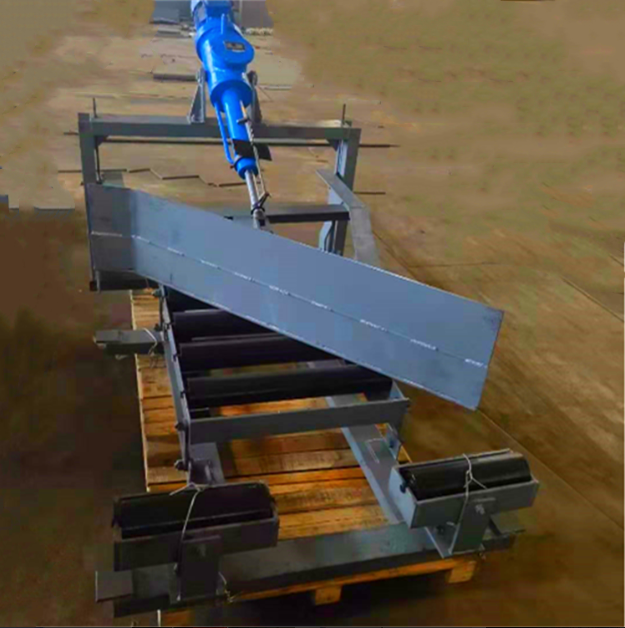 The electro-hydraulic scraper unloader is powered by an electro-hydraulic push rod, propelling the frame forward to lower the plow blade and support the flat roller. The lower edge of the blade conforms to the belt, completing the unloading process. After completion, the frame retracts, the plow blade is lifted, the deformed roller returns to its trough shape, and the belt resumes its trough shape, allowing the material to pass smoothly.