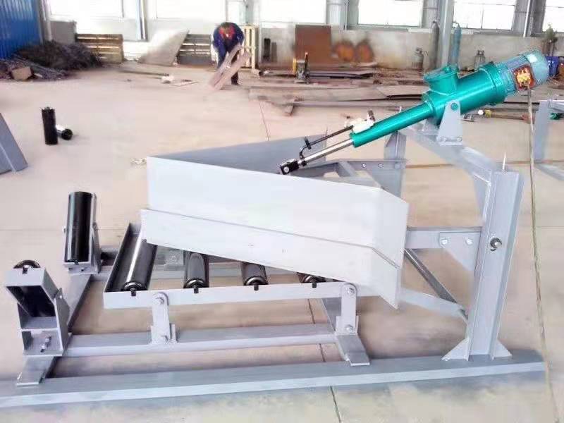 Type single or double-sided plow-type unloading device, powered by an electro-hydraulic push rod. During operation, the push rod extends to drive the linkage, advancing the frame to lower the head and support the flat roller assembly, ensuring the belt working surface is flat. The lower edge of the head is tightly sealed to the belt surface, depositing the material onto the hopper and delivering it to the designated location. After unloading, the electro-hydraulic push rod retracts to pull back the linkage, causing the frame to retreat, lifting the plow head. The roller assembly transitions from parallel to trough shape, allowing the material to pass smoothly. (The principle of the electro-hydraulic push rod is explained in the linkage section.)