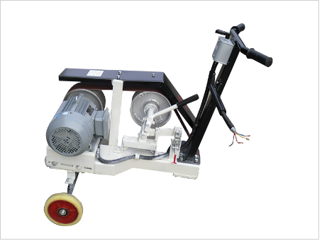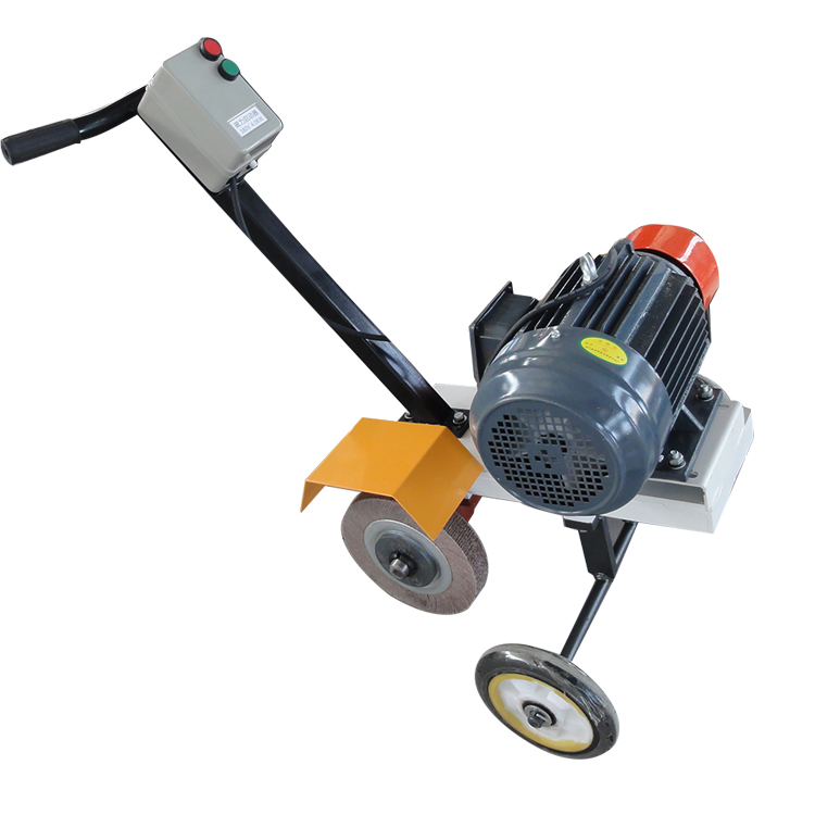 The machine is primarily composed of the drive mechanism, sand belt tensioning mechanism, contact wheel (grinding wheel) system, bracket, support foot, caster wheel, sand belt, hand push rod, etc. The motor directly transmits power to the drive wheel, which drives the sand belt to rotate at high speed. The sand belt is tensioned by the tensioning mechanism, and grinding is performed using the contact wheel. Depth adjustment devices are set on both sides of the contact wheel to control the grinding depth, ensuring that the weld can be flattened without damaging the base material.