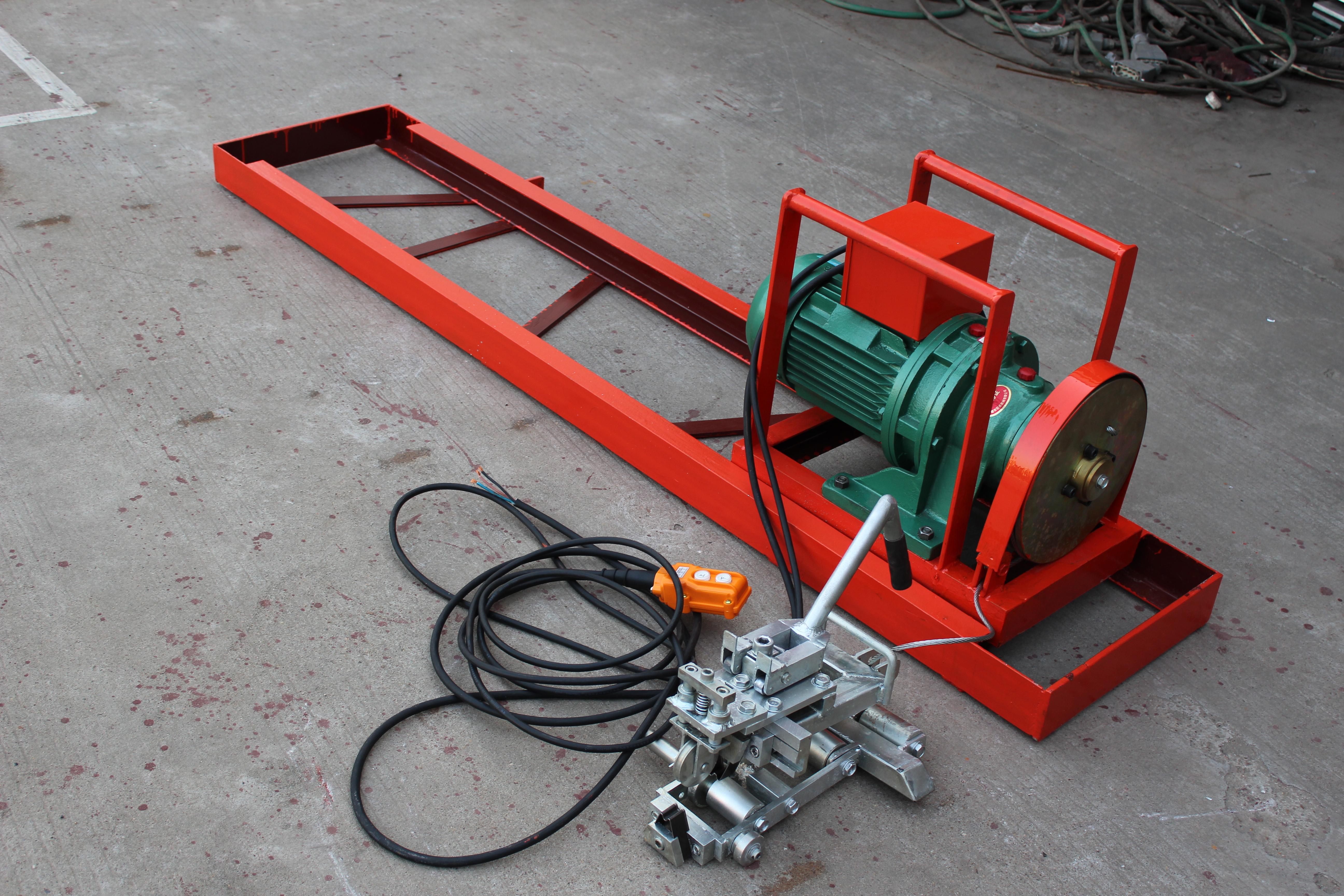 自动调节牵引装置是钢丝绳剥头机的配套装置,由牵引装置和滑行轨道两部分组成。