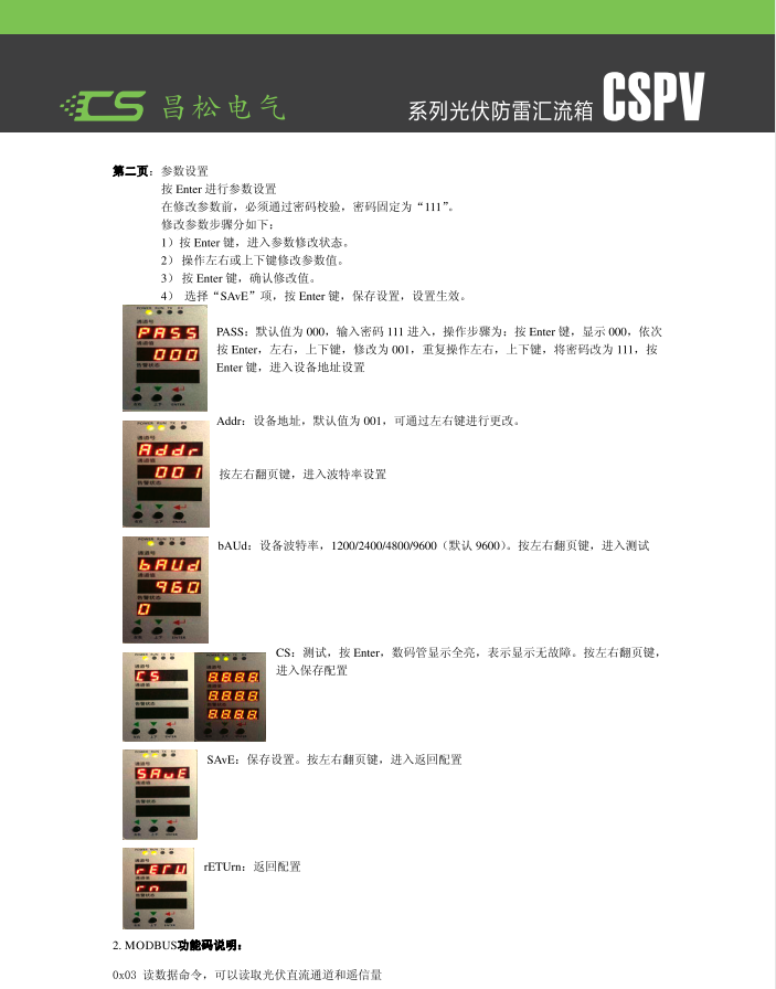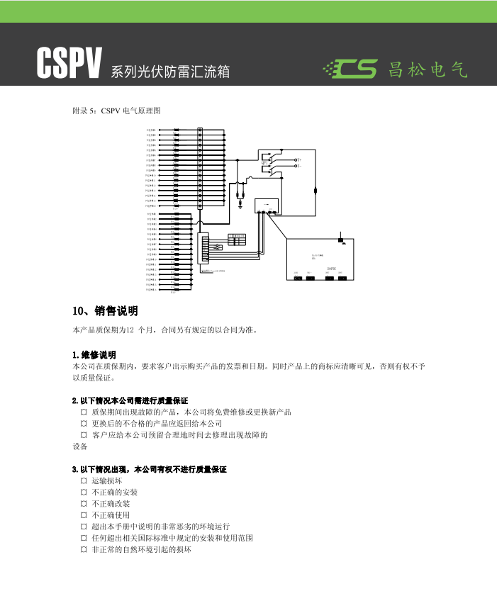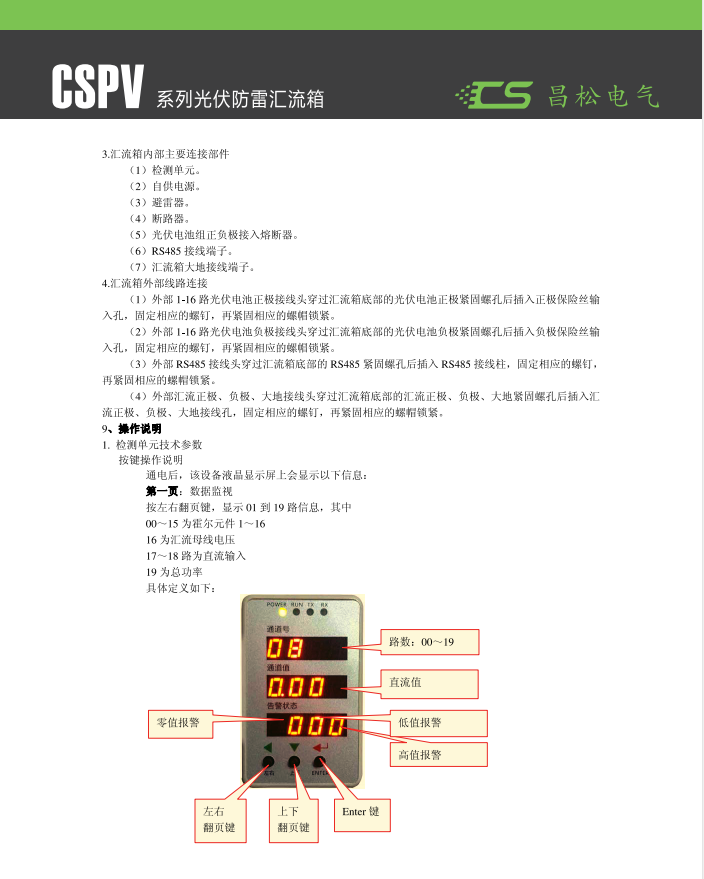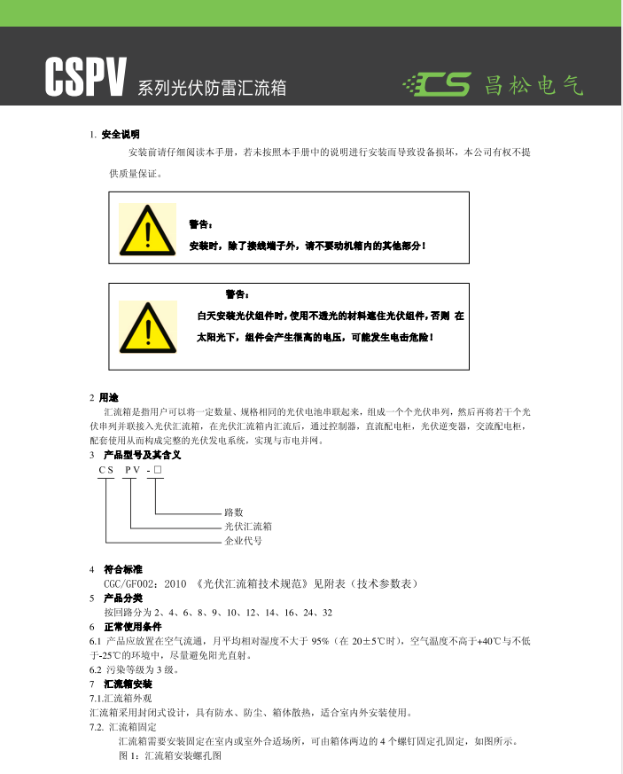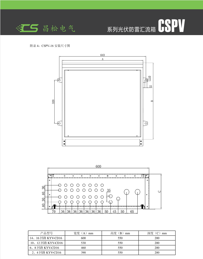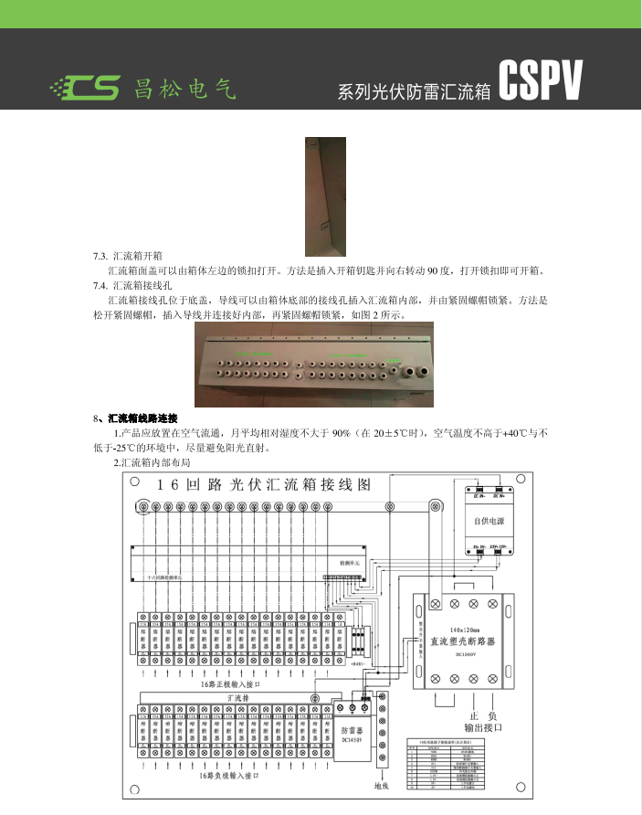 CSPV-16 Photovoltaic Lightning Protection Distribution Box, mainly used between the AC output side of inverters in distributed photovoltaic systems and the power distribution and grid connection cabinets. The product features lightning protection, short-circuit protection, and overcurrent protection. The box is made of 201 stainless steel, with a protection grade up to IP65. The door of the box is sealed with foam strips to prevent dust and rainwater from渗入. The product is stable, reliable, durable, and easy to install, providing maximum protection for users' personal safety. (Note: Sizes can be customized according to customer requirements.)