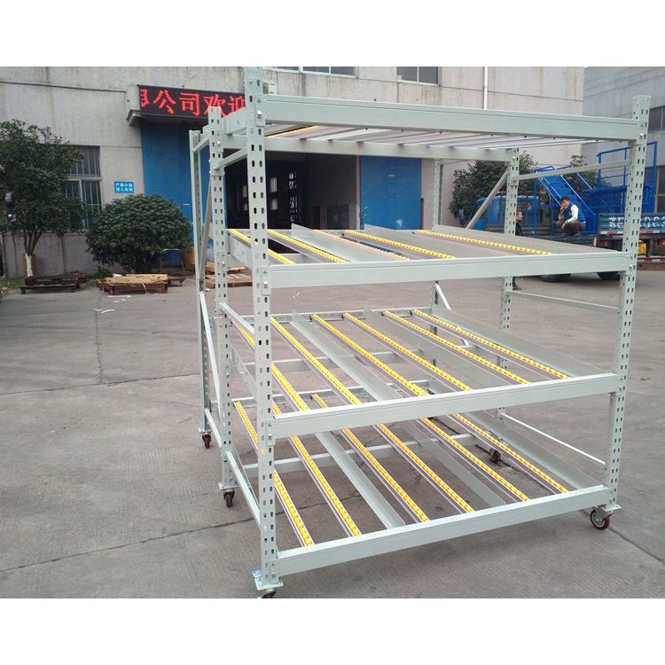 | The Flow Rack is equivalent to the Flow-Through Rack, commonly evolved from medium-sized beam racks. It transports goods from the picking end to the loading end via rollers, allowing goods to slide down automatically under gravity, enabling "first-in, first-out" operation. It is cost-effective, with fast storage speed and high density. Typically used in lean production lines in enterprises. Characteristics of the Flow Rack: 1. Equipped with roller-type aluminum alloy flow bars, utilizing the weight of the goods for "first-in, first-out" storage. 2. Easy to store and retrieve, suitable for assembly line sides, distribution centers, and similar locations. 3. Ideal for storing large quantities of similar goods, with high space utilization, particularly suitable for automotive parts factories. 4. Can be equipped with electronic labels for information management of goods. |