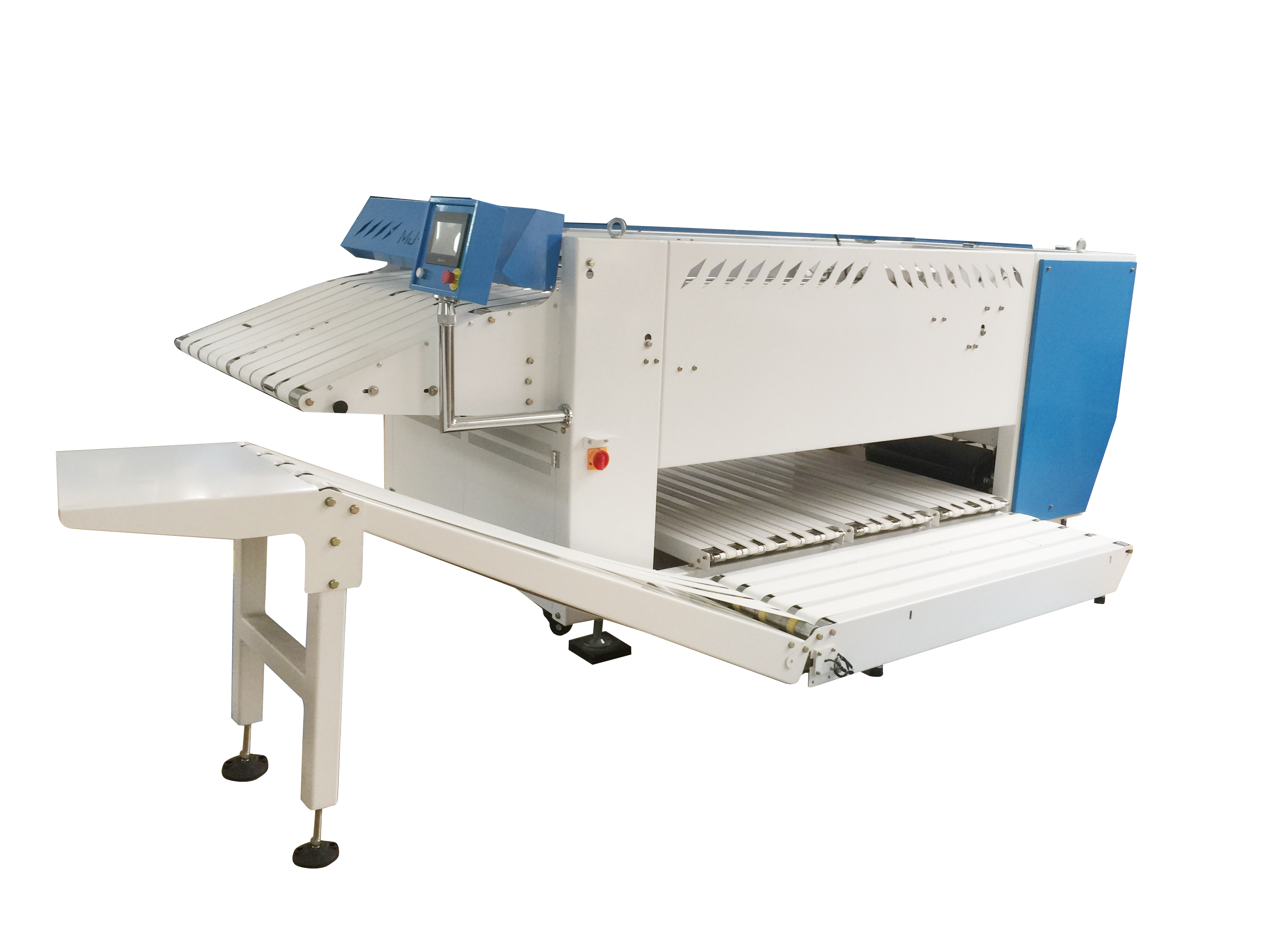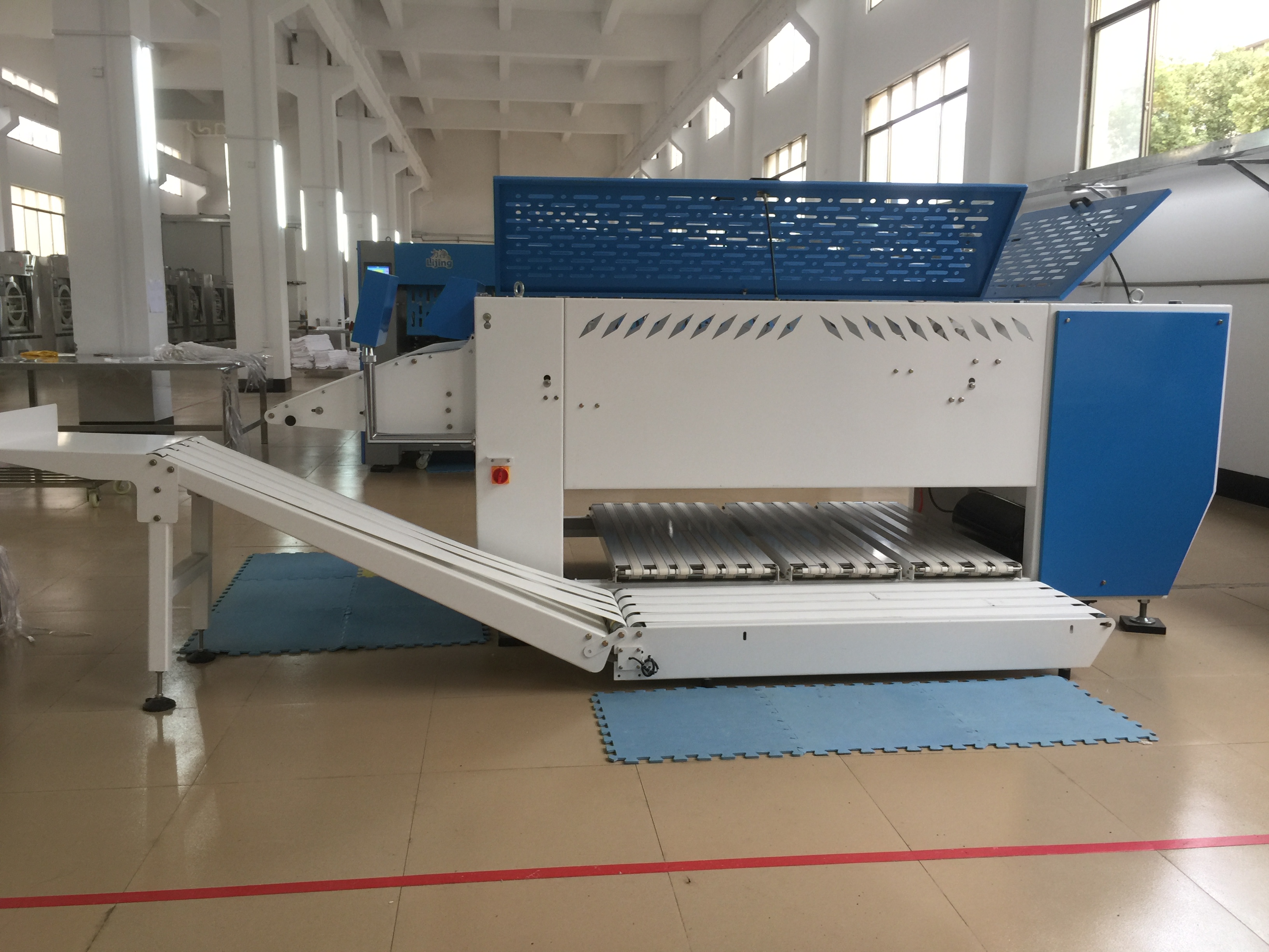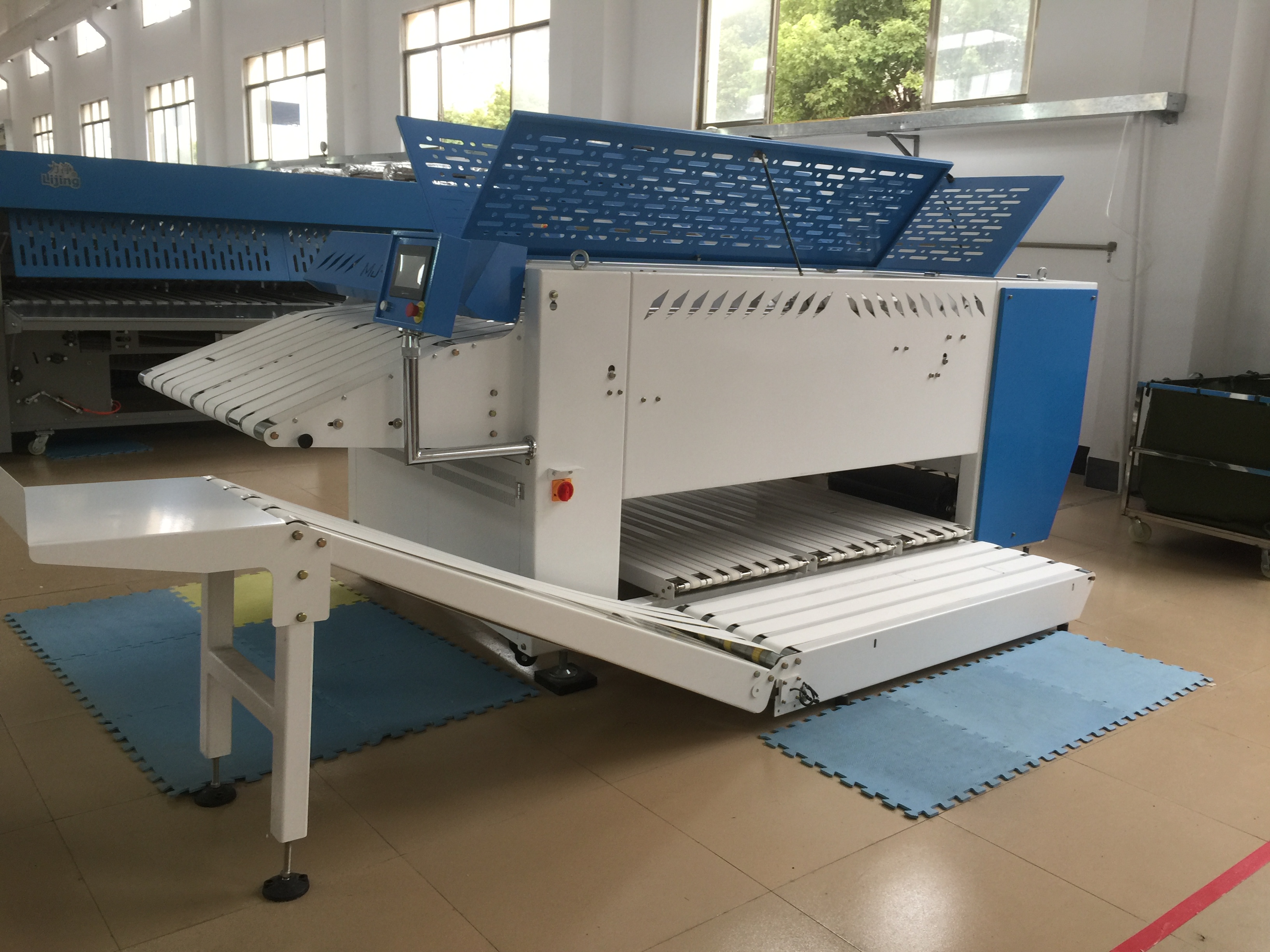 The automated equipment for towel folding developed by our company, with a towel folding speed of up to 50m / min, can fold 900 to 1200 towels, 4 folding times, and folding specifications of 1200 * 1800mm. The control system adopts touch screen computer for automatic control, and the man-machine interface transmits operating information, which can automatically reduce labor costs and increase labor productivity.