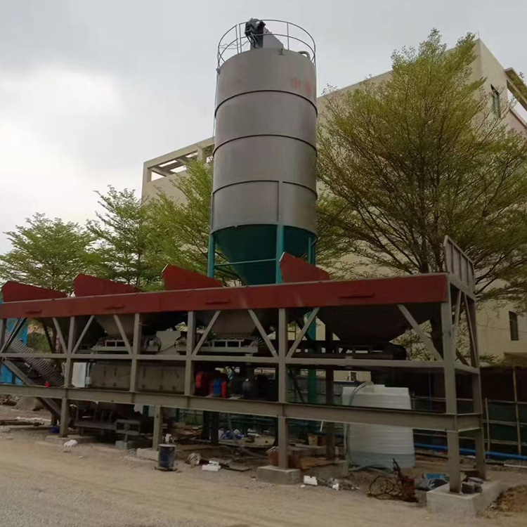 The portable mixing station features a trailer design, with the batching conveyor, mixing main unit, various weighing systems, spiral conveyors, and powder storage bins highly integrated into the overall structure.