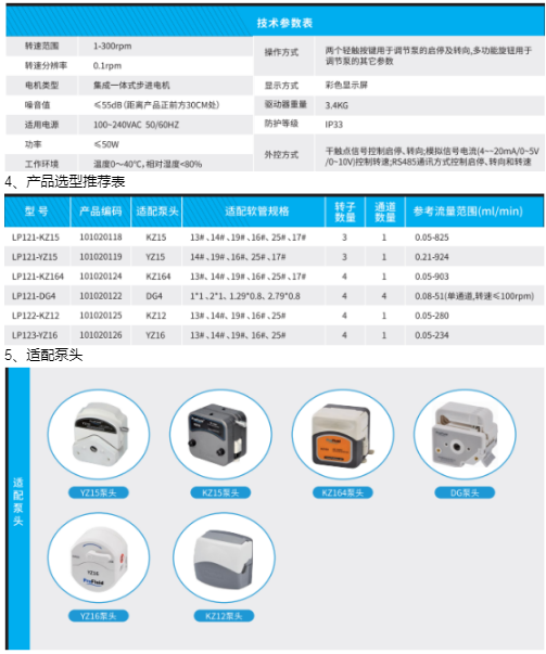 LP120 is a basic type variable speed peristaltic pump, featuring an engineering plastic housing that is resistant to ultraviolet rays and can be used with organic solvents and epoxy.EthaneAwaiting sterilization. The lower shell is made of aluminum alloy, offering strength, durability, and strong anti-interference capabilities. Driven by a stepper motor, it operates smoothly with low noise, equipped with a cooling fan to prevent overheating during long-term high-load operation. It can automatically remember the parameters before power failure, eliminating the need for reconfiguration. It supports multiple control methods, including 0-5V, 0-10V, and 4-20mA analog signal speed regulation, as well as RS485 communication for controlling flow rate. Two buttons control start/stop and rotation direction, with simple operation. It also features verification and hose selection functions, allowing for accuracy in flow rate when paired with different pump heads and hoses.