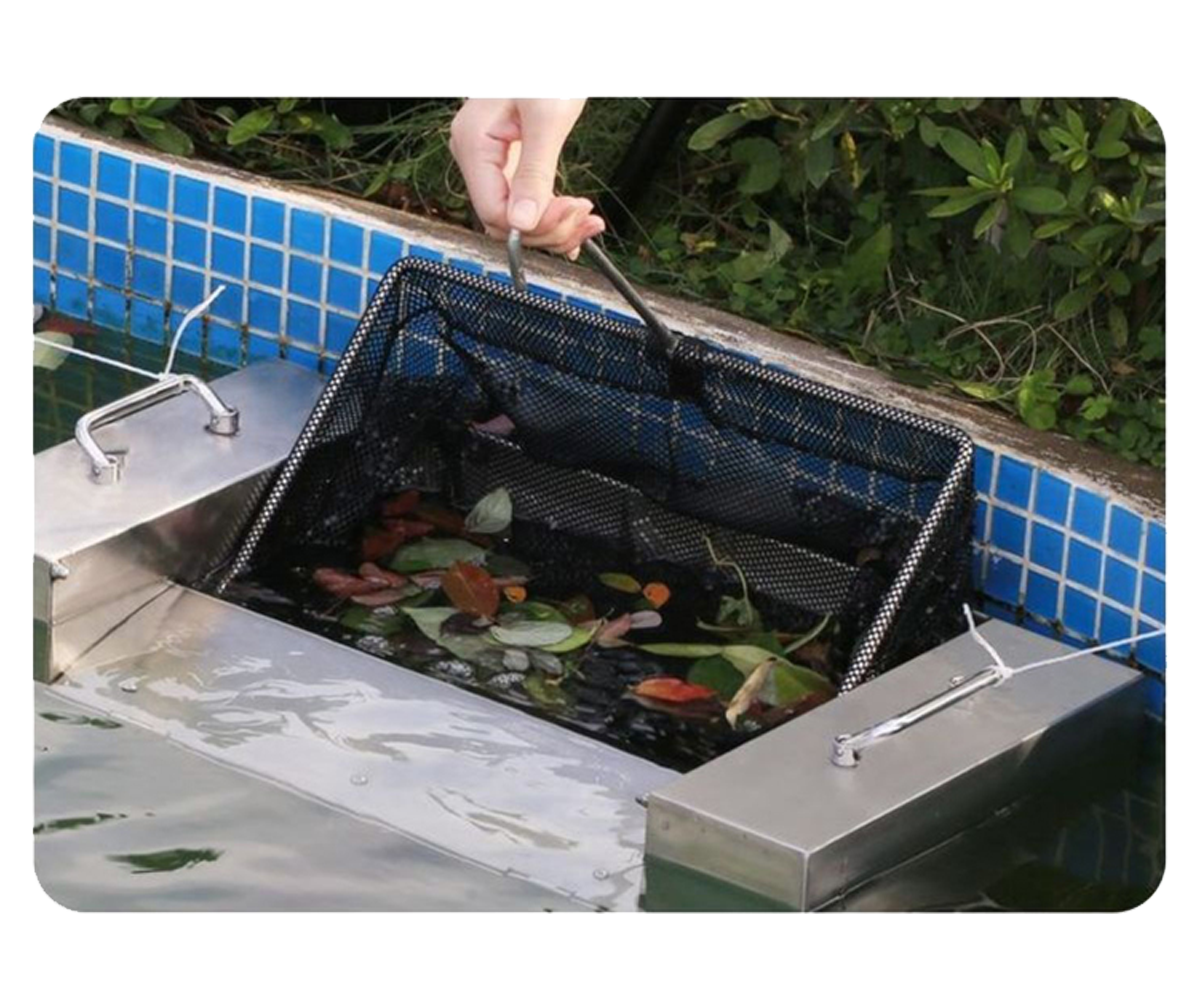 To address surface floating debris, this product utilizes the reverse water intake principle of the pump's inlet to generate power. This power propels the water from bottom to top, causing the peripheral water surface on one side of the skimmer to flow rapidly towards the skimmer. This action guides the floating debris into the collection basket, automatically collecting surface floating matter. This process aims to purify water quality, reduce labor intensity, and save maintenance costs.