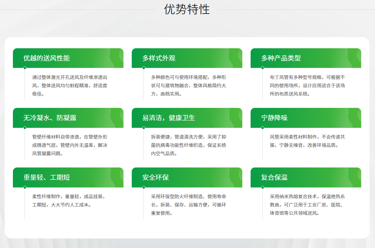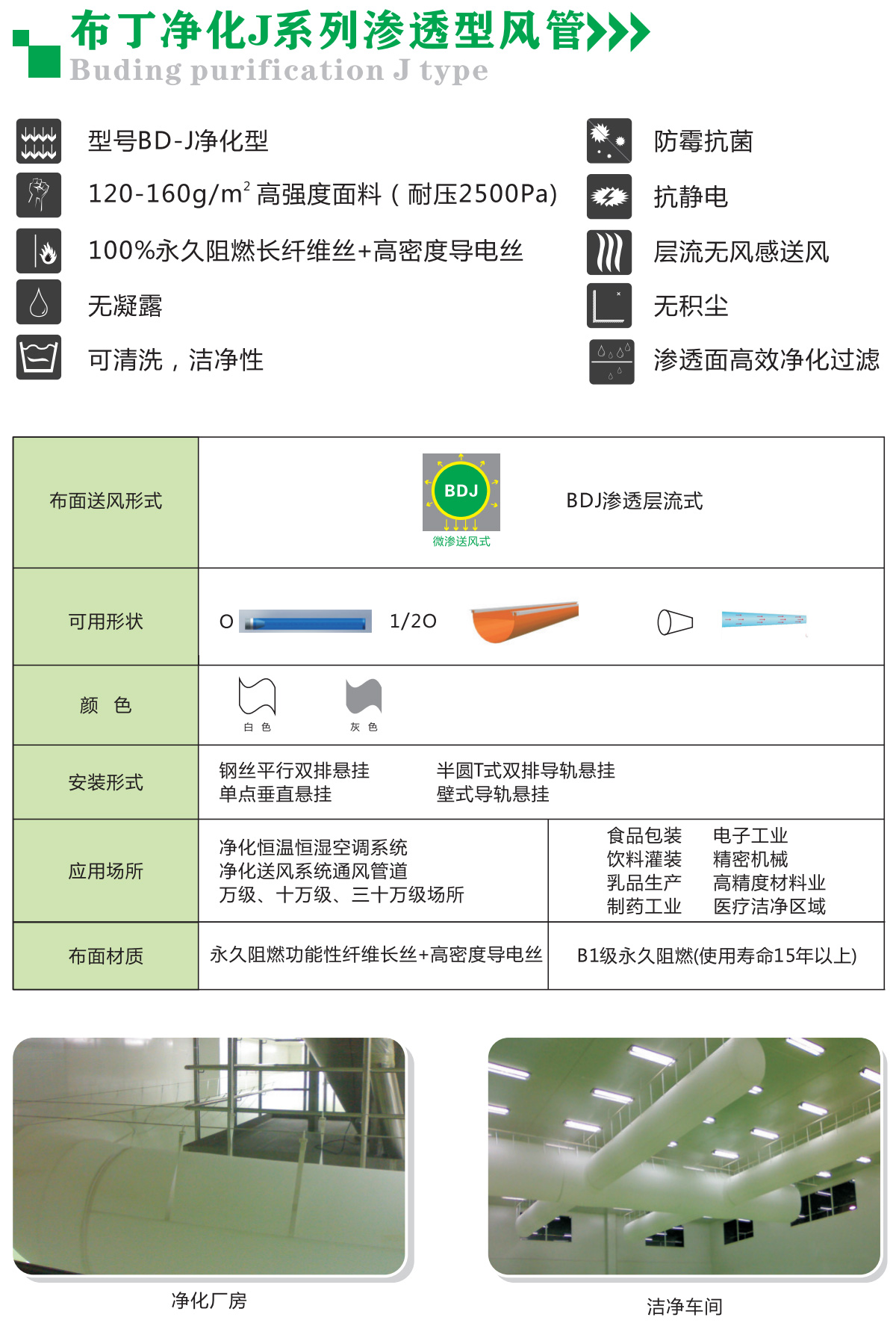 Product Highlights:The Pudding BD-J Purification Fabric Air Distribution System is a precision laminar airflow penetration terminal air distribution system. It is designed to work with purification air conditioning units, featuring a penetration surface pore size of 0.4um, equivalent to the pore size of a high-efficiency filter dusting surface, effectively filtering dust in the air. The surface of the duct is specially treated to achieve bacteriostatic and anti-static effects. It ensures the air in the air distribution area remains clean.