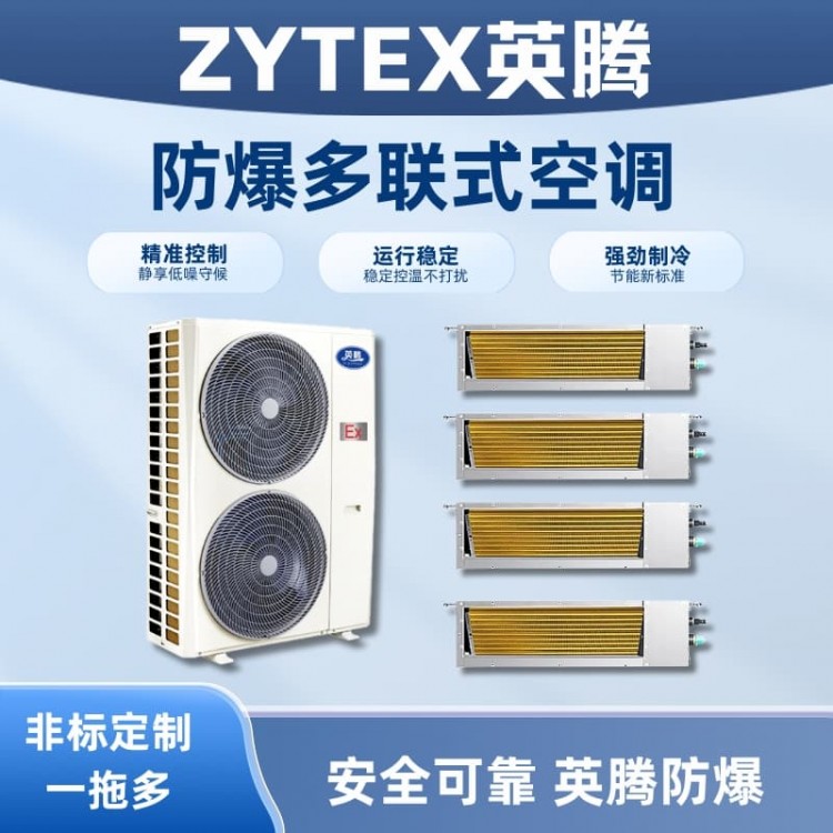 "Yingteng" explosion-proof multi-split air conditioning series models have been processed with special explosion-proof technology, making them suitable for flammable and explosive areas in Zones 1 and 2. They are widely used in scientific research, oil, chemical, pharmaceutical, and power plant settings where IIA, IIB level T1 to T4 combustible gases, steam, and air mixtures may form explosive hazards. Explosion-proof multi-split air conditioners are ideal for locations with temperature requirements. Yingteng's explosion-proof multi-split air conditioners have passed inspections by the National Supervision and Inspection Center for Quality of Explosion-Proof Electrical Products and received explosion-proof certification and CCC certification. They feature an aesthetically pleasing design, reasonable structure, and ease of installation and maintenance. The entire series employs brand-name compressors, microcomputer intelligent control, digital display, and boasts low noise, stable performance, simple operation, and reliability, making them highly favored in the market. (Customizable options include explosion-proof window air conditioners, explosion-proof duct air conditioners, explosion-proof ceiling air conditioners, explosion-proof fresh air air conditioners, explosion-proof marine air conditioners, explosion-proof corrosion-resistant air conditioners, explosion-proof high-temperature air conditioners, explosion-proof cold storage air conditioners, explosion-proof modular air conditioners, and explosion-proof multi-split air conditioners, etc.)