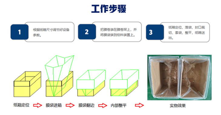 The Automatic Carton Bagging Machine automatically fits plastic bags over cardboard boxes and folds the edges over the box flaps, significantly reducing labor, material, and space costs. It's easy to operate and adjust. When used in conjunction with an Automatic Unboxing Machine, it greatly enhances efficiency and reduces the need for manpower. It is suitable for packaging a variety of products such as food, chemicals, electronics, stationery, plastics, hardware, screws, beverages, toys, and more. Our company's carton bagging machines have successfully partnered with several chemical raw material companies, food ingredient companies, and mechanical parts processing companies.
