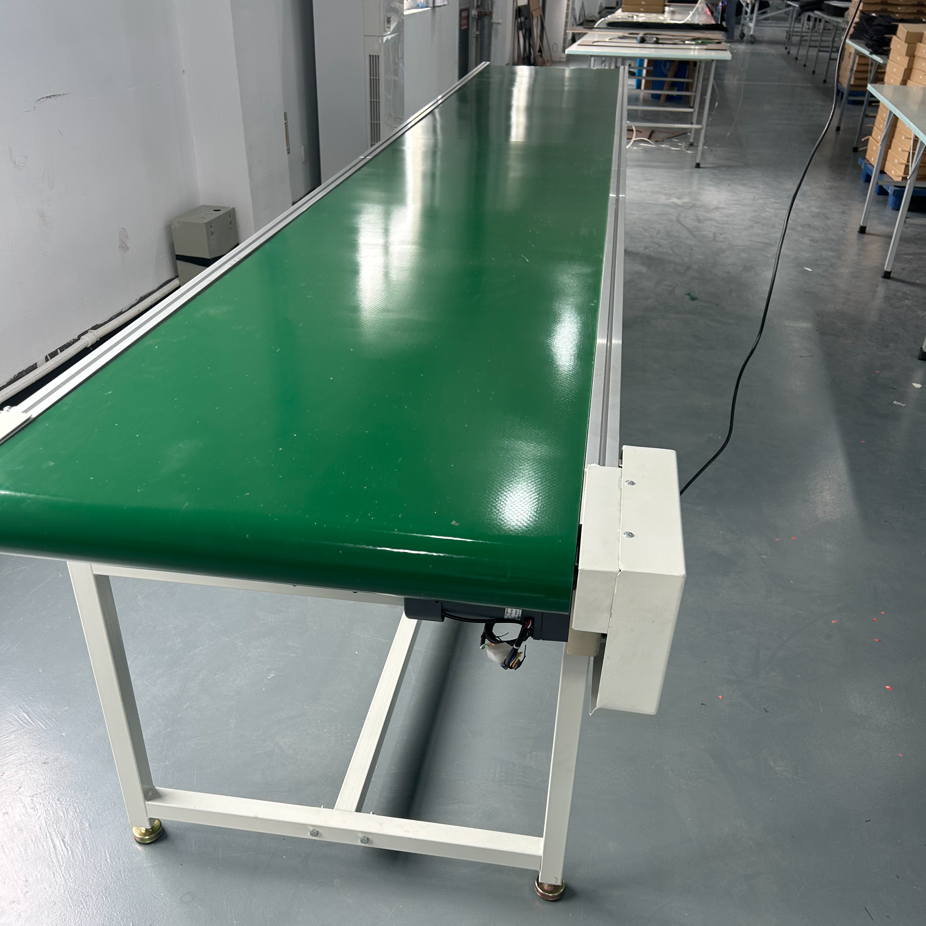 The drive unit powers the conveyor belt in a continuous loop. Items are placed on the belt, supported by idlers to maintain stability, and conveyed at a fixed rhythm to each workstation, achieving continuous production. The tensioning device automatically adjusts the belt tension to ensure operational efficiency.