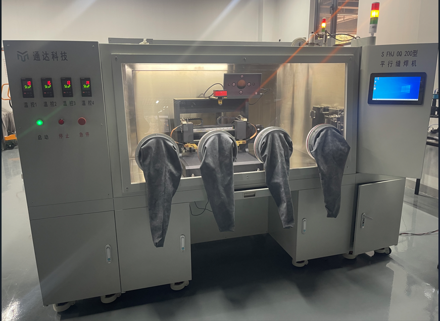 S FHJ O 200-Q The type parallel seam welding machine (system) first undergoes vacuum heating (temperature controllable) treatment on the parts to be welded, ensuring all volatile substances and residual moisture on the surface of the parts are thoroughly removed; secondly, employs gas (nitrogen) protection technology to isolate the welding environment completely from the surrounding environment (using a gas-tight glove box); thirdly, utilizes high-frequency pulse (adjustable) current welding, allowing for adjustable welding point spacing and thermal dissipation coefficient to ensure the shell temperature does not exceed the permissible limit; fourthly, during the welding process, the lid and shell are always under a certain (adjustable) pressure, overcoming the decrease in welding quality due to lid deformation and ensuring the welding seal meets the required standards.