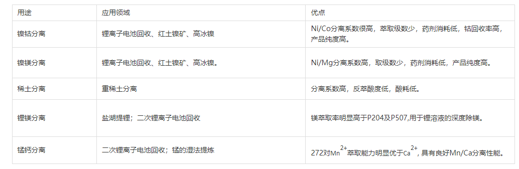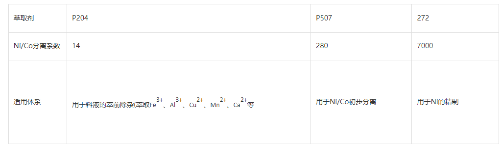 From the table above, it can be seen that 272 has a high separation coefficient for nickel/cobalt, requiring fewer stages of extraction for separating Ni and Co, resulting in lower initial investment for equipment and extractants. The resulting nickel salt product has a high purity and is suitable for the purification of nickel.