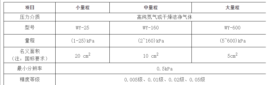 准确度等级:0.005级、0.01级、0.02级、0.05级;- 功能:检定微压压力变送器、压力传感器、微压膜片压力表、数字压力计等