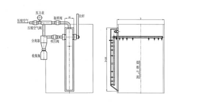 The swing arm coal powder sampling device, as shown in the attached figure, is primarily composed of a sampling tube installed centrally in the shell of the coal powder pipeline and an external air extraction and separation unit. The sampling tube can rotate around the pivot axis, rotating it to a perpendicular position to the pipeline during sampling, allowing the nozzle mounted on the sampling tube to face the coal powder airflow; after sampling, the sampling tube returns to a parallel position with the pipeline, avoiding the coal powder airflow to prevent wear; compressed air blowing is used to prevent coal powder from entering the shell and the center of the sampler, ensuring reliable operation with no maintenance required.
