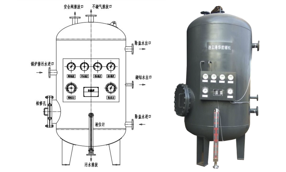 Boilers of various types require continuous and regular discharge of wastewater with high TDS values and harmful sediments from the boiler drum to ensure steam quality and safety during normal operation. The current practice for treating boiler wastewater typically involves draining it into a continuous drain expansion vessel, flashing off a small amount of steam to be reused in an oxygen-removing unit, and then discharging the remaining, still relatively hot wastewater along with the boiler's regular wastewater into a fixed drain expansion vessel for expansion and pressure reduction. The small amount of steam flashed off is released directly into the atmosphere, while the remaining wastewater around 100°C is cooled by mixing with cold water before discharge or directly into a trench. Due to the working pressure of the oxygen-removing units, especially higher for high-pressure ones, the wastewater discharged from the continuous drain expansion vessel tends to be at a higher temperature. This not only wastes a significant amount of heat energy and high-quality water sources but also contributes to considerable white steam and noise pollution in the surrounding environment due to the large amount of steam released from the fixed drain vessel's top.