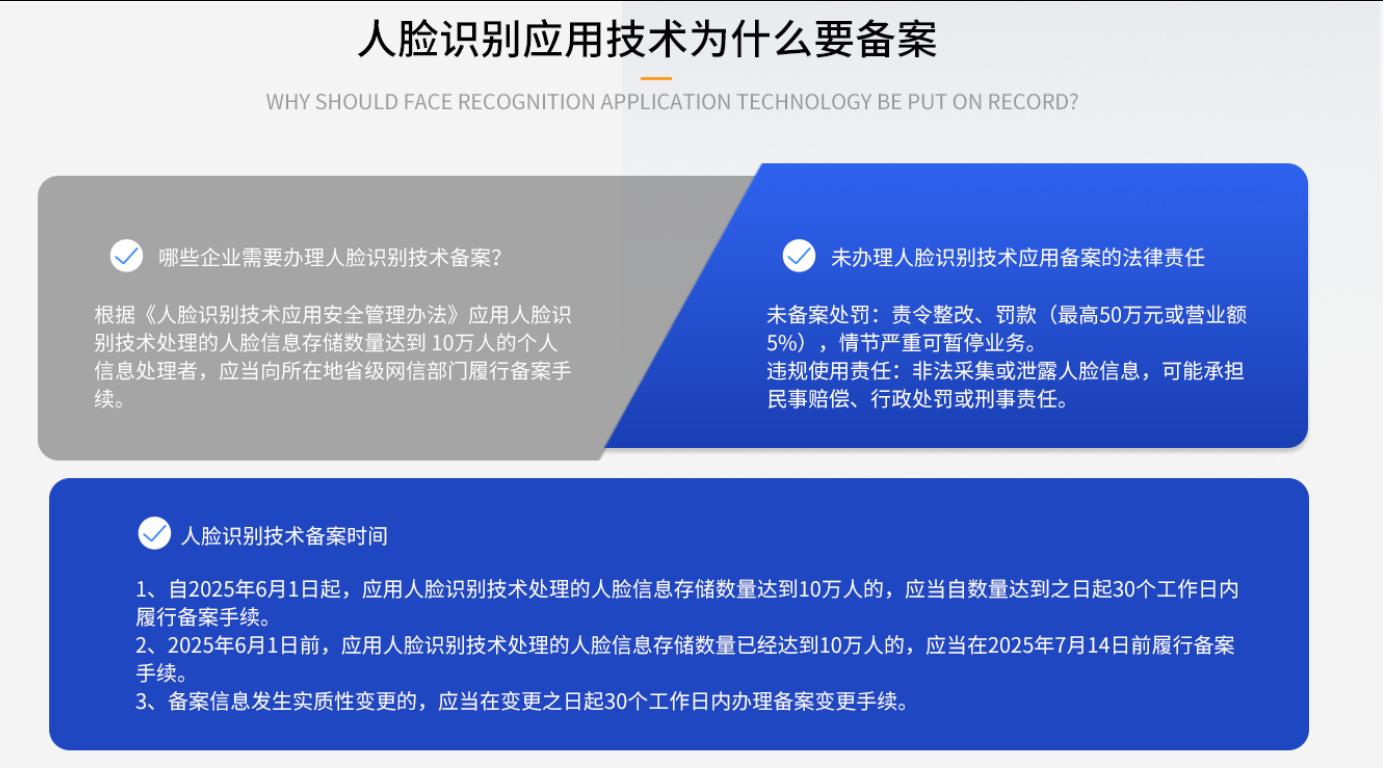 According to the "Measures for the Security Management of Facial Recognition Technology Applications", personal information processors who have stored facial information processed by facial recognition technology for 100000 people shall complete the filing procedures with the provincial cyberspace administration department where they are located.