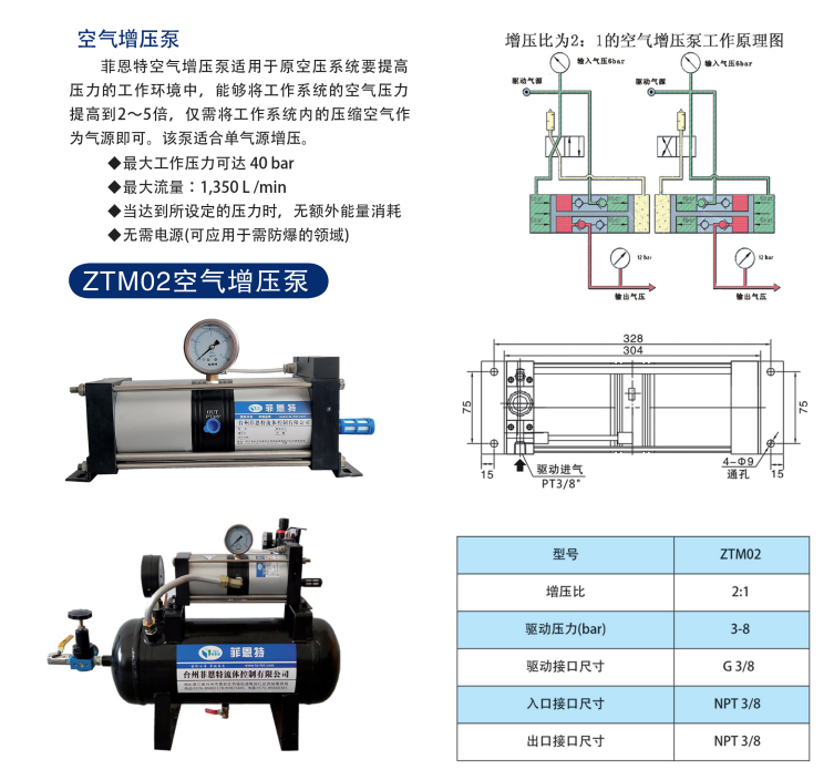Air Boost Pump, also known as a Gas Amplifier, is suitable for environments where the pressure of the original compressed air source is insufficient, not reaching the normal operating conditions for secondary boosting! It uses compressed air as the power source and the gas booster pump as the pressure source, with the output gas pressure proportional to the driving gas source pressure.