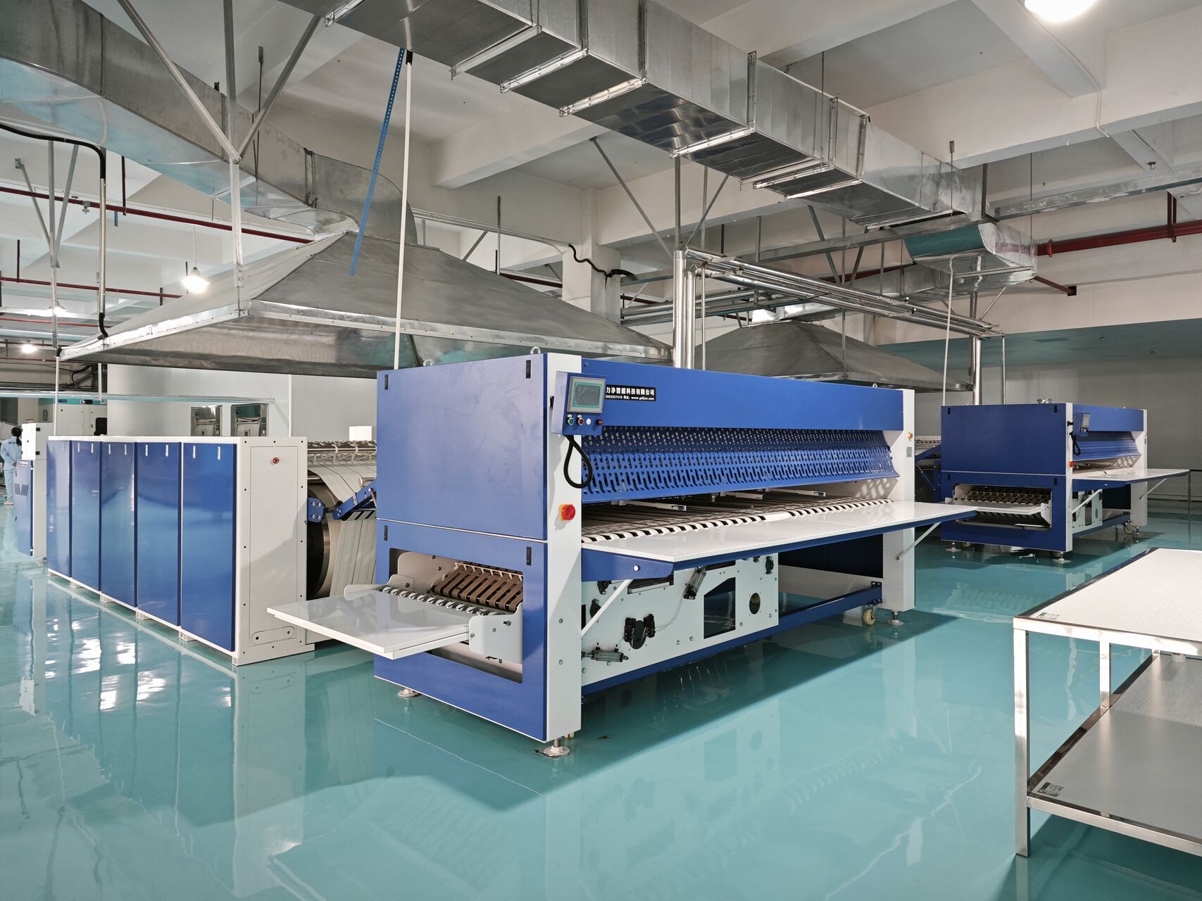The automated equipment for towel folding developed by our company, with a towel folding speed of up to 50m / min, can fold 900 to 1200 towels, 4 folding times, and folding specifications of 1200 * 1800mm. The control system adopts touch screen computer for automatic control, and the man-machine interface transmits operating information, which can automatically reduce labor costs and increase labor productivity.