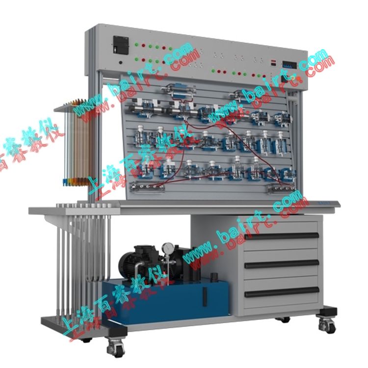Mechanical requirements for hydraulic transmission vary widely, typically comprising basic functional circuits such as directional control, pressure control, speed control, and sequence control loops. The main frame of this experimental bench is meticulously crafted from 1.0mm cold-rolled steel plate, finished with baked paint for aesthetics and durability. It is equipped with four high-quality, axially mounted swivel casters for easy mobility. The cabinet is divided into two sections below; the left side is for the hydraulic pump station, and the right side is a storage cabinet used to house transparent hydraulic components.