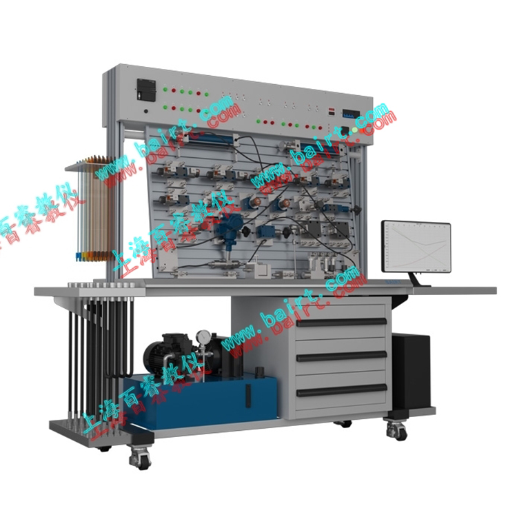 1. The experimental bench is composed of several parts, including the experimental workbench, hydraulic pump station, common hydraulic components, electrical control unit, and data acquisition system. 2. The experimental workbench consists of a steel (single molding process) main body and an aluminum alloy profile operational panel. The panel features an "T" groove-shaped aluminum alloy profile structure, allowing for convenient and flexible installation of hydraulic components and connection of experimental circuits.