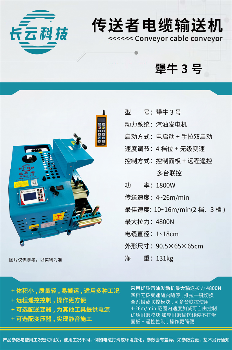 ●This unitGasoline-powered, dual-fuelCompact in structure, lightweight, and small in size, these are small yet efficient, easy to move, and ideal for long-distance cable laying in confined spaces. Perfect for applications such as bridge tray cables, subway tunnel cables, instrument cables, and electrical control line installations.