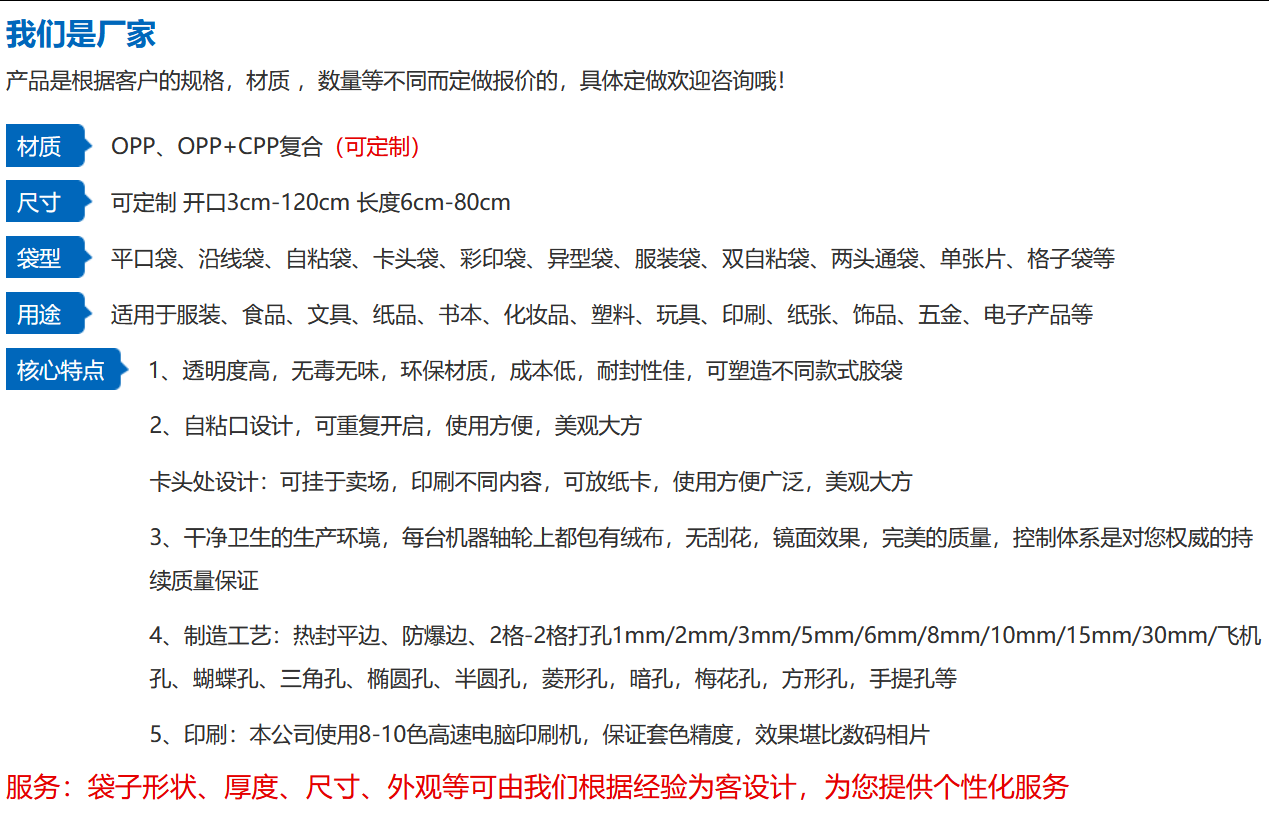 | Bag-shaped | Flat pouch, Side-seamed pouch, Self-adhesive pouch, Carded-head pouch, Color-printed pouch, Odd-shaped pouch, Garment pouch, Double self-adhesive pouch, Open-ended pouch, Single sheet, Grid pouch | |