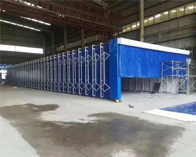 The telescopic paint spray room is specially designed for comprehensive applications where heavy-duty workpieces are difficult to move and in work areas. Standard fixed ante-rooms cannot handle the process of moving heavy-duty workpieces in and out, making it impossible to transport items requiring crane handling. The mobile ante-room overcomes this drawback. Before painting, the workpiece is first retracted by pressing the control button, clearing the painting area. Once the workpiece is securely placed by the crane, the control button is pressed to open the mobile ante-room to cover the workpiece, without the need to move the workpiece again, thus ensuring no disruption to the crane's operation. The mobile ante-room consists of multiple sets of frames that can move parallel to each other, along with flame-retardant篷 fabrics connected to the frames. The sliding connection mechanism between the frames ensures that the frames remain vertically parallel as they move along the overhead track, driven by the installation, while also unfolding and closing the篷 fabrics.