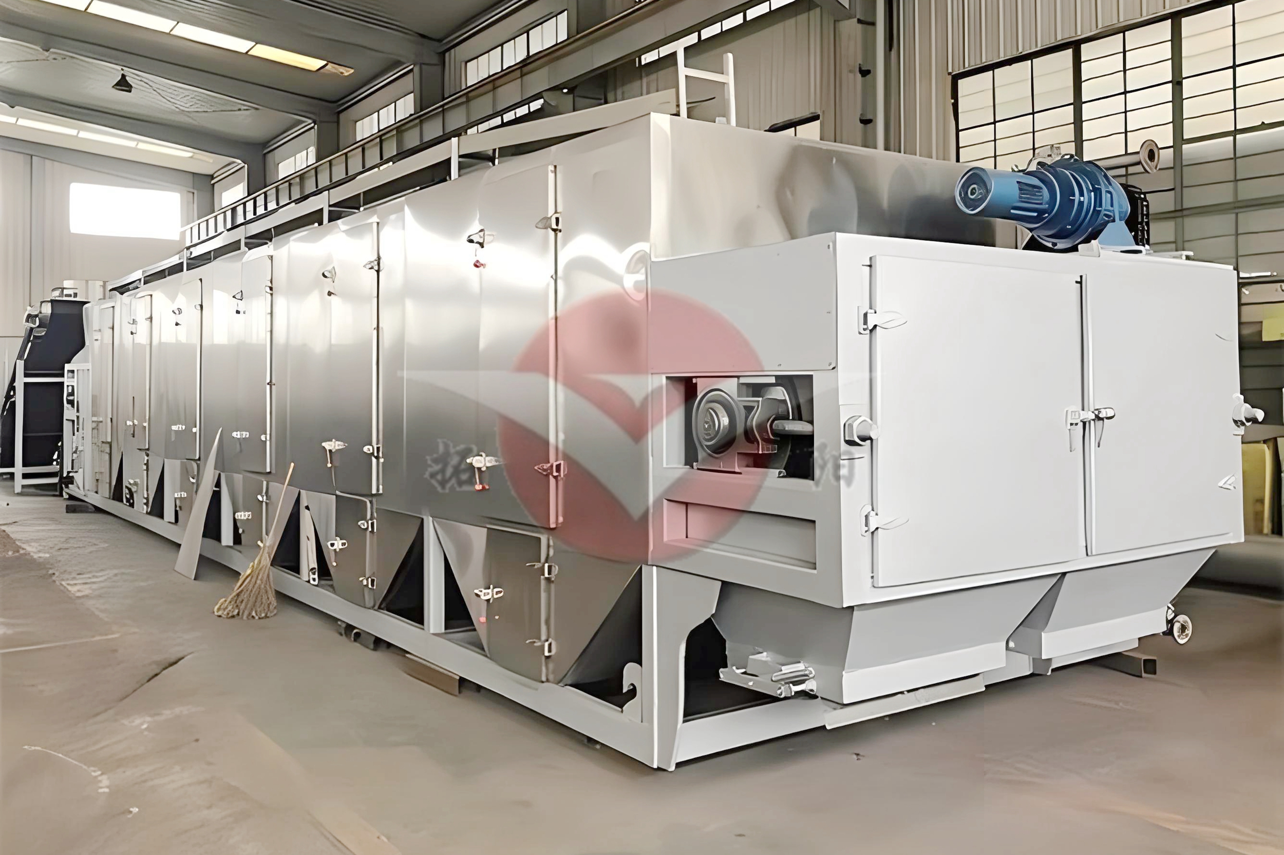 The material to be processed is distributed onto a conveyor belt by an appropriate feeding device (such as a star-type distributor, swinging belt, shredder, or granulator). The conveyor belt passes through a channel consisting of one or more heating units, each equipped with an air heating and recirculation system. Each channel is fitted with one or more dehumidification systems. As the conveyor belt passes through, hot air flows upwards or downwards through the material on the belt, ensuring uniform drying.