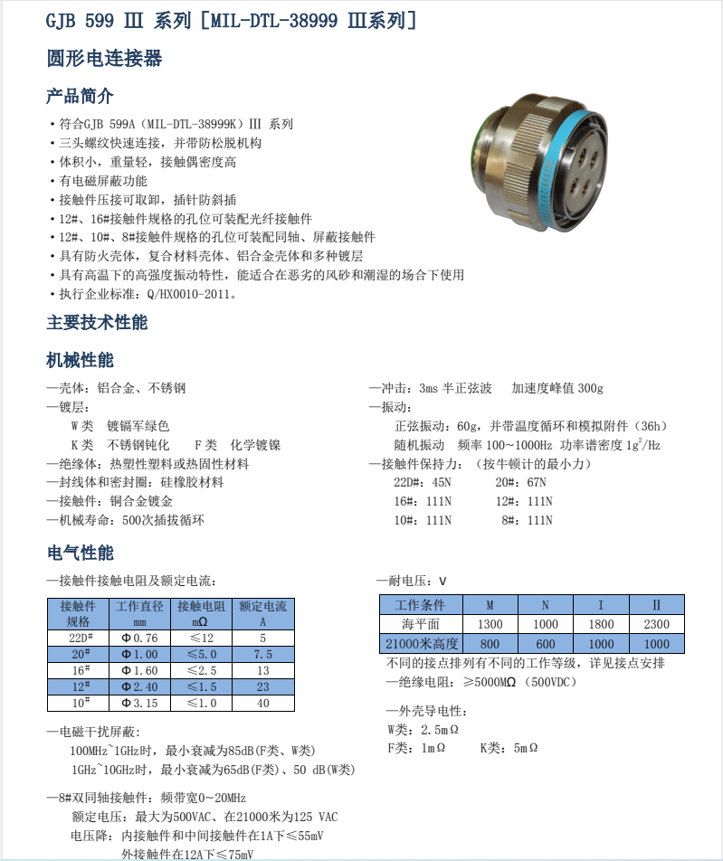 MIL-DTL-38999KIII series circular electrical connectors, compliant with GJB599A standards, feature three-threaded connections and anti-loosening mechanisms. Their performance is opposite to the 599II series, offering high vibration resistance at high temperatures, suitable for operation in harsh environments.