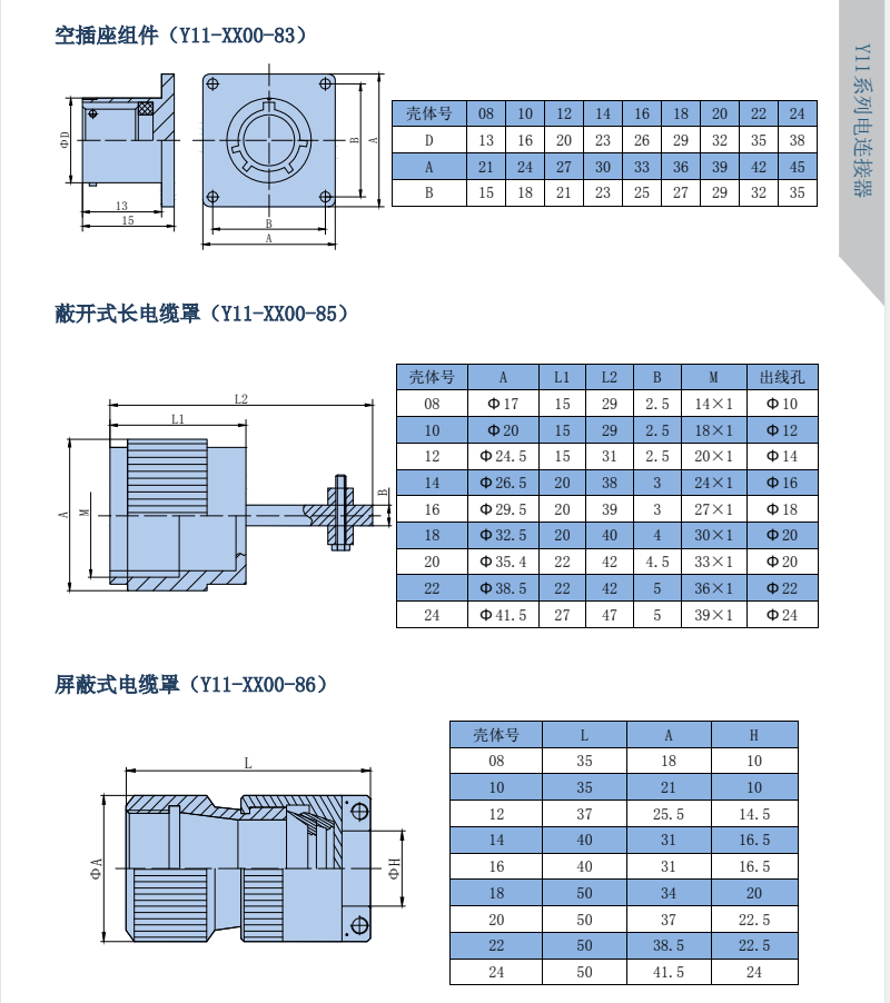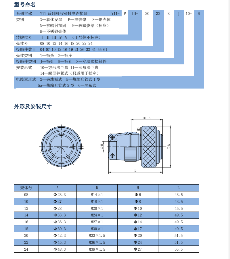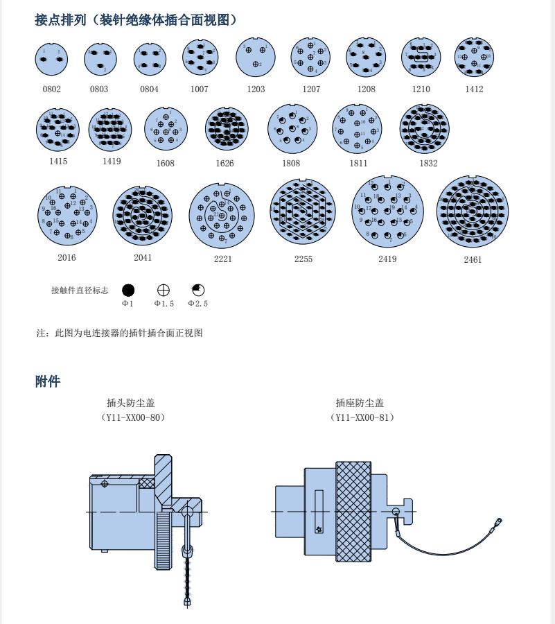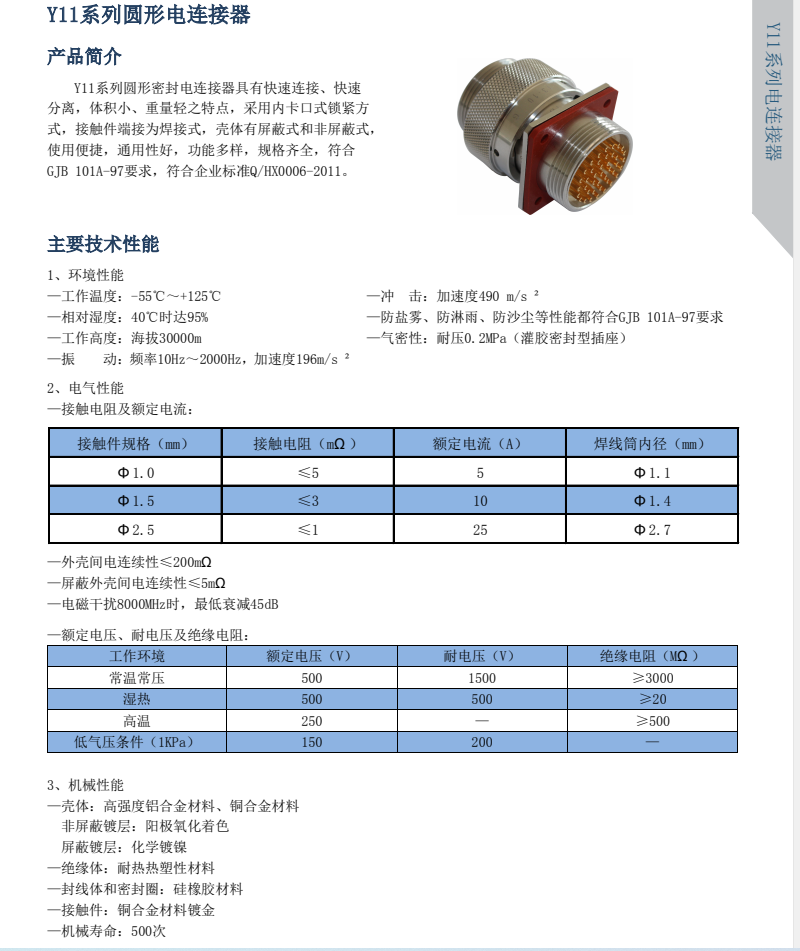 Y11X Series Round Sealed Connectors, equivalent to Y50X Series, plug-in potting seal, withstands 0.2MPa air pressure, operates normally in light rain outdoors, plug and socket bayonet connection, with three bayonet pins for secondary locking, shock-resistant, cost-effective, suitable for both military and civilian products.