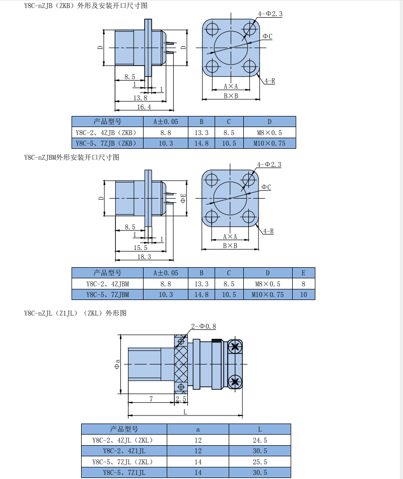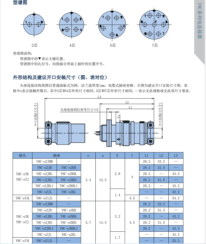 Y8C Round Electrical Connector, compact design, threaded connection, few cores, available in 2-core, 4-core, 5-core, and 7-core configurations, with sparse arrangement, no breakdown phenomenon.