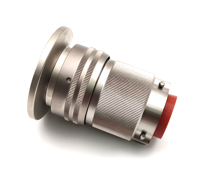 The product utilizes the KF40 flange size, featuring a central 55P Kovar alloy pin design, and is enhanced with a special processing technique - glass sintering, which ensures good sealing performance. It offers two types of connections with the plug: threaded and bayonet connections. The plug material is selected based on the application environment, available in aluminum alloy and stainless steel. It is used for connecting vacuum equipment to cables, facilitating data transmission.