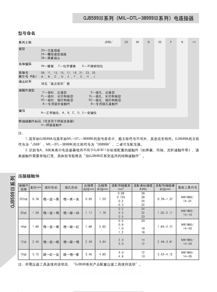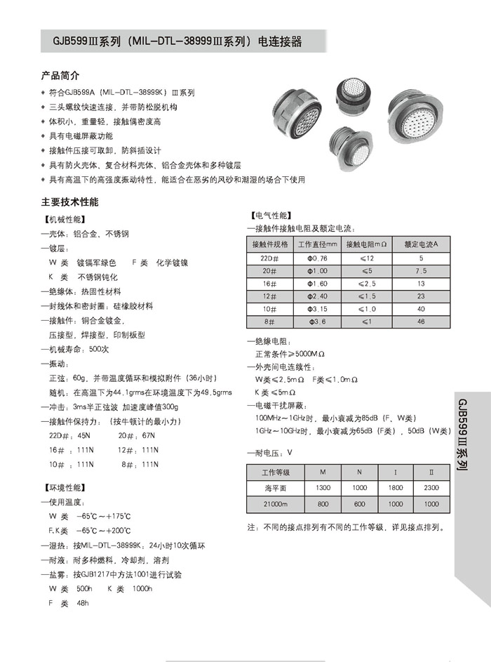 J599/26WB35PN + J1784A high-density aviation connectors comply with GJB599A standards and refer to the MIL-DTL-38999K III series military specifications. They feature three-threaded connections and anti-loosening mechanisms, with a three-proof tail. Contact pieces are soldered and can be removed. The connectors and sockets are designed with anti-misinsertion features. The housing is available in metal and composite materials. Suitable for use in sandy and humid environments, on aviation and aerospace electronic equipment.