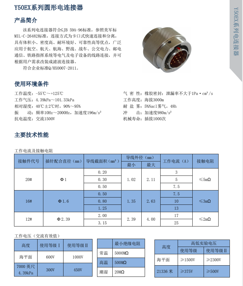 The Y50EX series circular electrical connectors comply with GJB598A-96 standards and meet MIL-DTL-26482H quality standards. They feature a quick-connect bayonet, dual locking structure, and welding termination. With five key positions to choose from, they offer blind mating functionality. Plugs and sockets can accommodate both pins and holes, making them versatile for a wide range of applications. Customers have ample selection space, and they are generally used for connections between marine, land, and air equipment, as well as in power and electrical devices.
