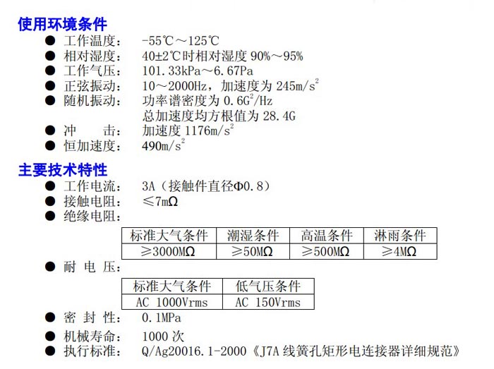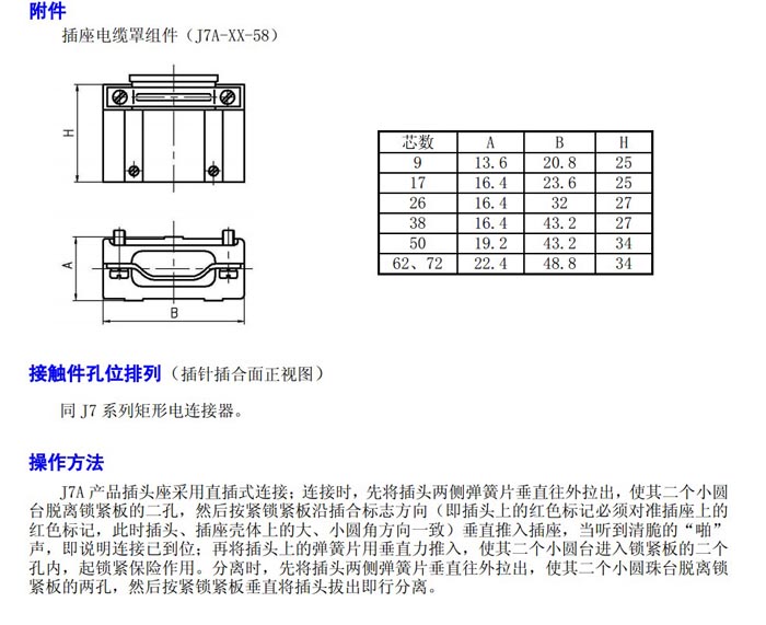 J7A rectangular electrical connector with spring-loaded pin holes is suitable for circuit connections between electronic and electrical equipment systems.