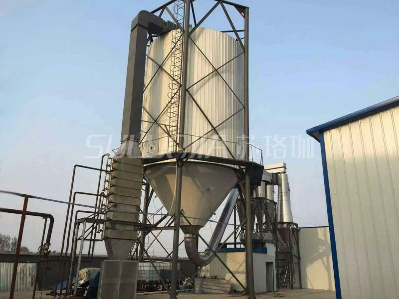 Air is filtered and heated before entering the top air distributor of the dryer, where it spirals in evenly into the drying chamber. The liquid material is then subjected to high-speed centrifugal atomization at the top of the tower, (rotating) sprayed into extremely fine mist droplets. These droplets mix with the hot air and can be dried into finished product in a very short time. The finished product is continuously discharged from the bottom of the drying tower and the cyclone separator, while the exhaust gas is exhausted by the fan.