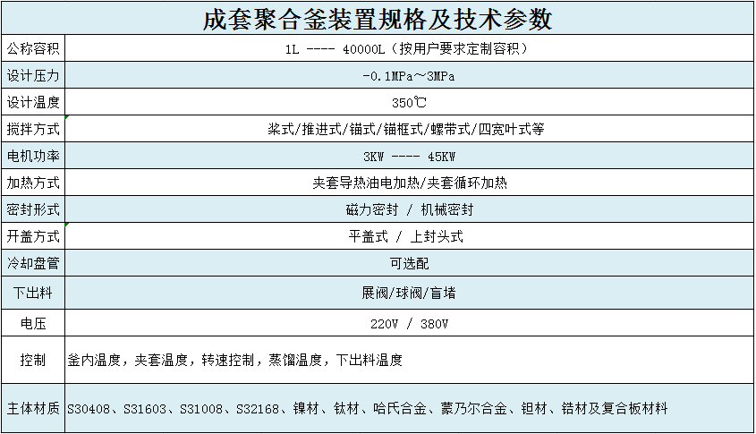 The structural form, pressure levels, heating methods, and impeller types of the complete polymerization kettle units can be designed and manufactured according to the user's technical requirements. The materials selected can be based on the user's medium requirements, producing various stainless steel, titanium, nickel, and carbon steel complete polymerization kettle units. Magnetic couplings and reaction vessels can be produced to match the user's technical specifications, with sizes available to suit any need.